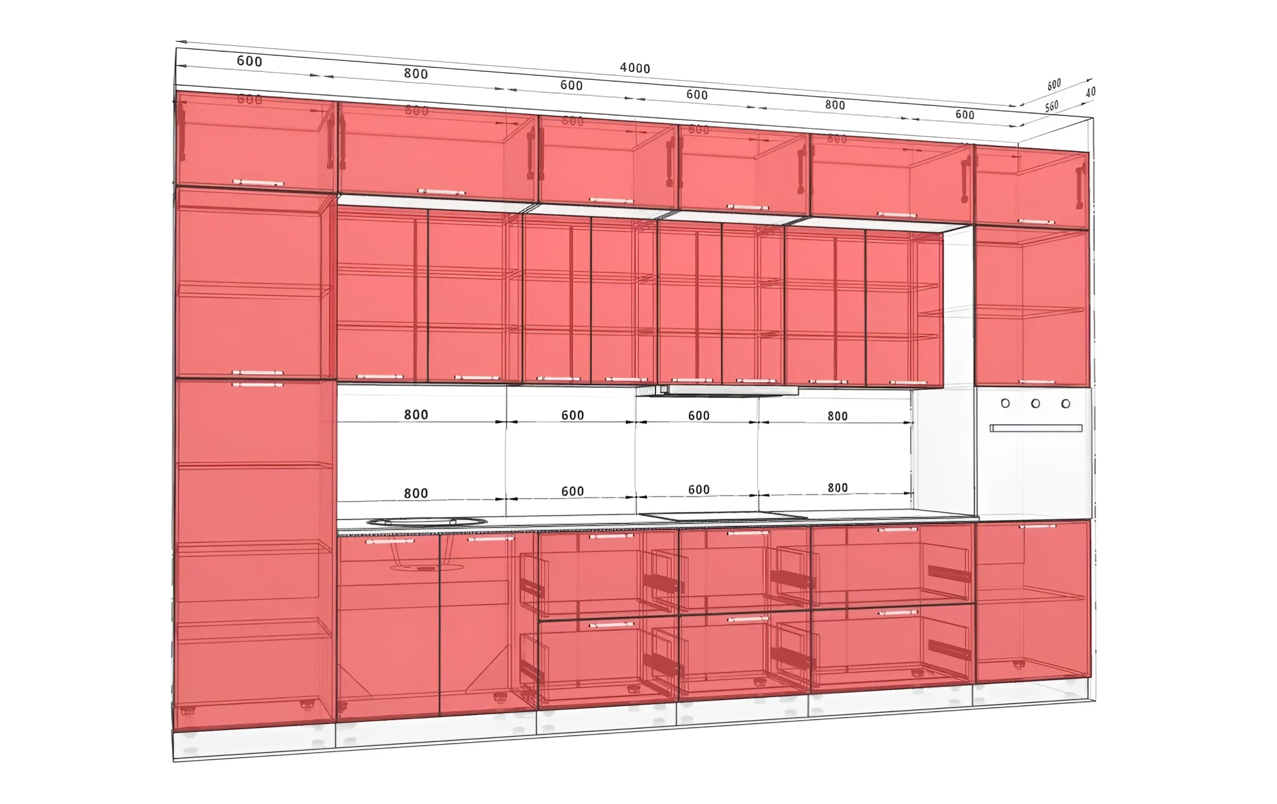 Длина кухни в 4 метра обеспечивает достаточно рабочего пространства для комфортного приготовления пищи, а также обширные зоны для хранения кухонной утвари и продуктов. Однако главной особенностью этой модели является ее впечатляющая высота – 2,5 метра «до потолка», дополненная антресолями. Такое решение позволяет использовать каждый сантиметр вертикального пространства максимально эффективно, создавая дополнительные места для хранения редко используемых предметов или сезонной утвари. Высота верхних шкафов варьируется: доступны варианты 1080 мм и 1280 мм, что дает возможность адаптировать дизайн под ваши индивидуальные потребности и высоту потолков, обеспечивая идеальную интеграцию в интерьер.