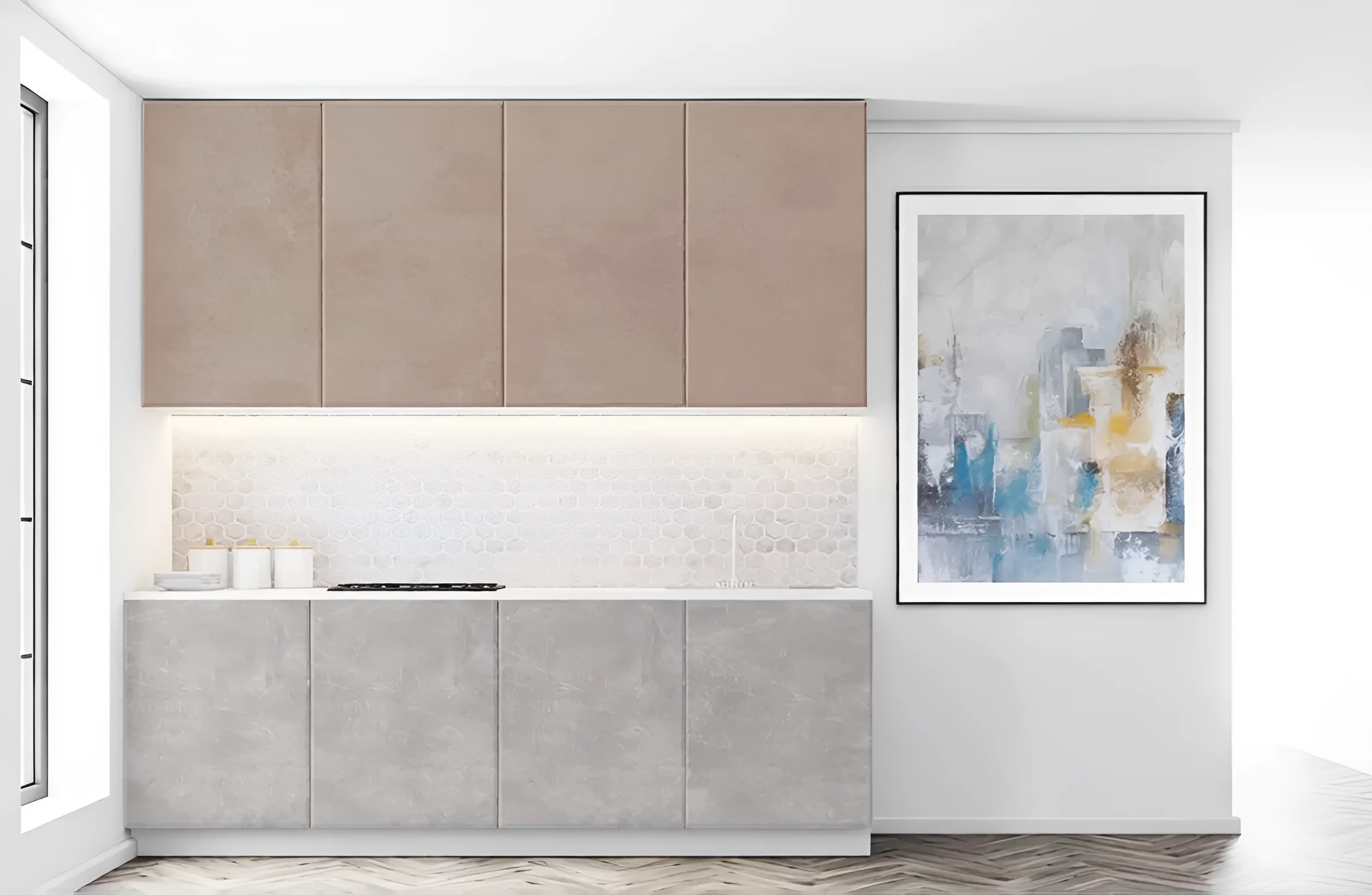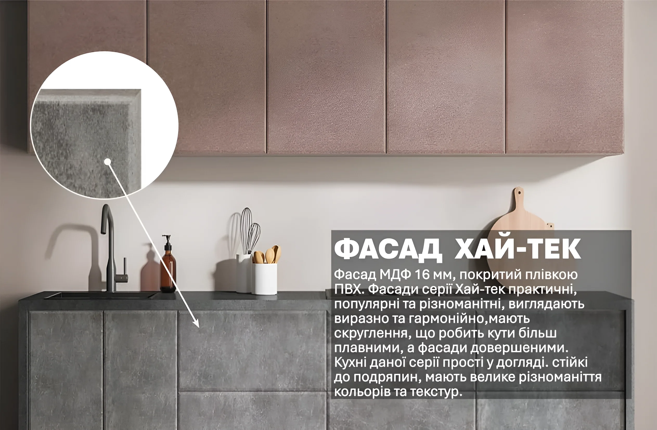 Серия «Хай-тек текстурированный» идеально вписывается в интерьеры, выполненные в стиле минимализм, лофт или, конечно же, хай-тек. Главная изюминка этой кухни — это ее фасады. Покрытие «Мрамор бетон» доступно в двух изысканных оттенках: теплом бежевом и универсальном сером. Вы можете выбрать один из них или скомбинировать, создавая уникальный и гармоничный интерьер. Текстурированная пленка ПВХ на фасадах МДФ не только имитирует благородный мрамор и грубоватый бетон, но и придает поверхности приятные тактильные ощущения, а также делает ее более устойчивой к повседневным воздействиям.