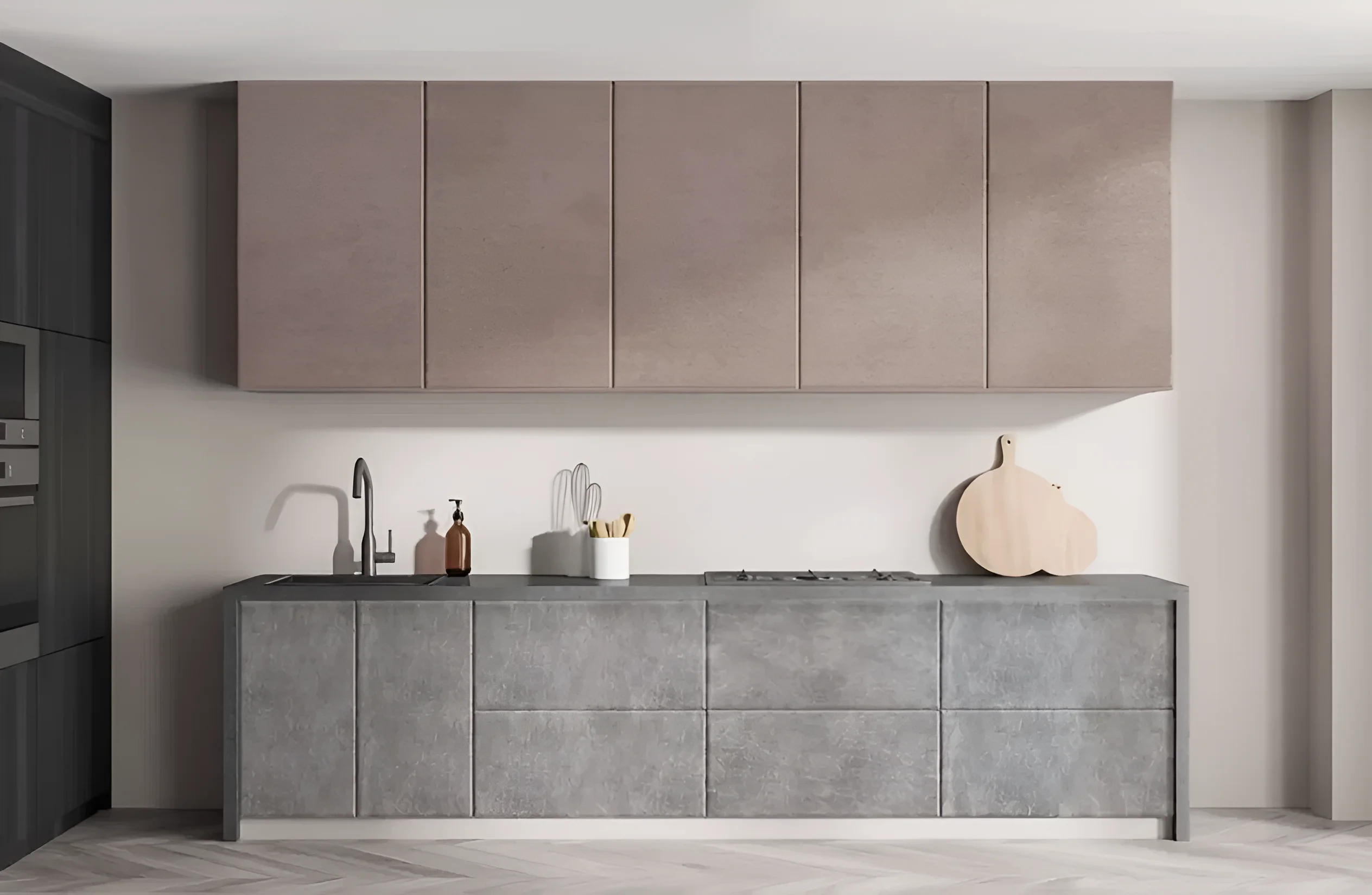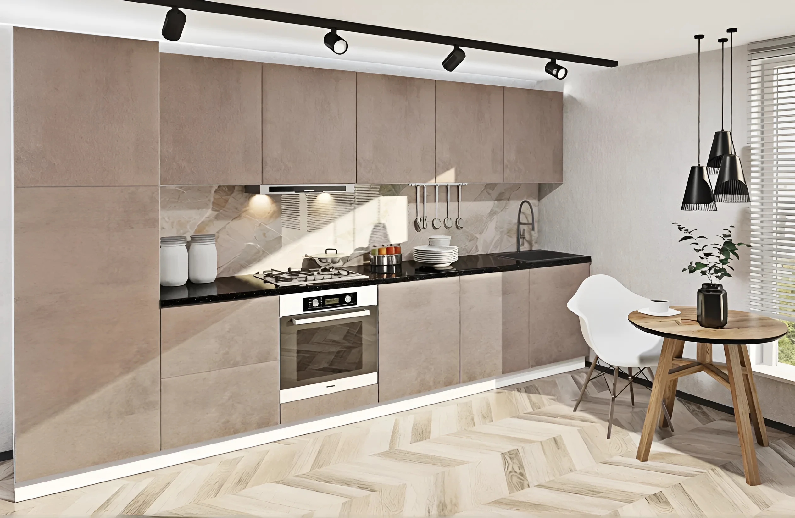 Кухня «Хай-тек» 2м полностью соответствует духу минимализма и функционального дизайна, столь популярных в современном интерьере. Фасады кухни выполнены из высококачественного МДФ и покрыты текстурированной ПВХ-пленкой, которая имитирует благородный мрамор и брутальный бетон. Это сочетание придает кухне уникальный, современный вид, делая ее по-настоящему выдающейся. Цветовые решения – «Мрамор бетон бежевый» и «Мрамор бетон серый» – позволяют легко вписать гарнитур в любой интерьер, от скандинавского до лофт-стиля, создавая атмосферу уюта и гармонии. Текстурированная поверхность не только выглядит стильно, но и приятна на ощупь, а также более устойчива к мелким повреждениям и загрязнениям, что облегчает уход за кухней. Дизайн «Хай-тек» всегда остается актуальным, предлагая чистые линии и отсутствие лишних деталей, способствуя созданию ощущения простора и порядка.