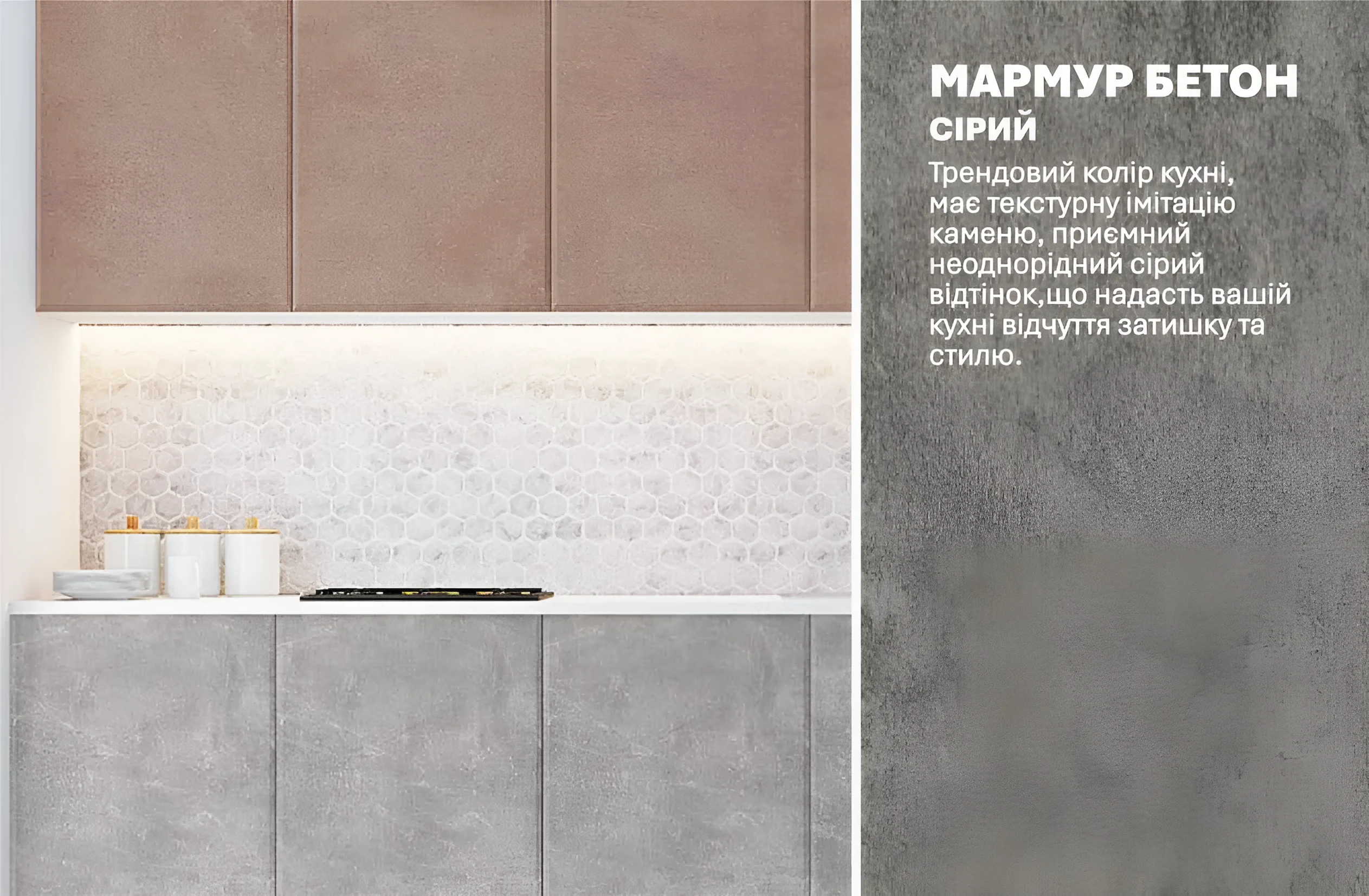 | Цвет фасада кухни | Мрамор бетон бежевый, Мрамор бетон серый |