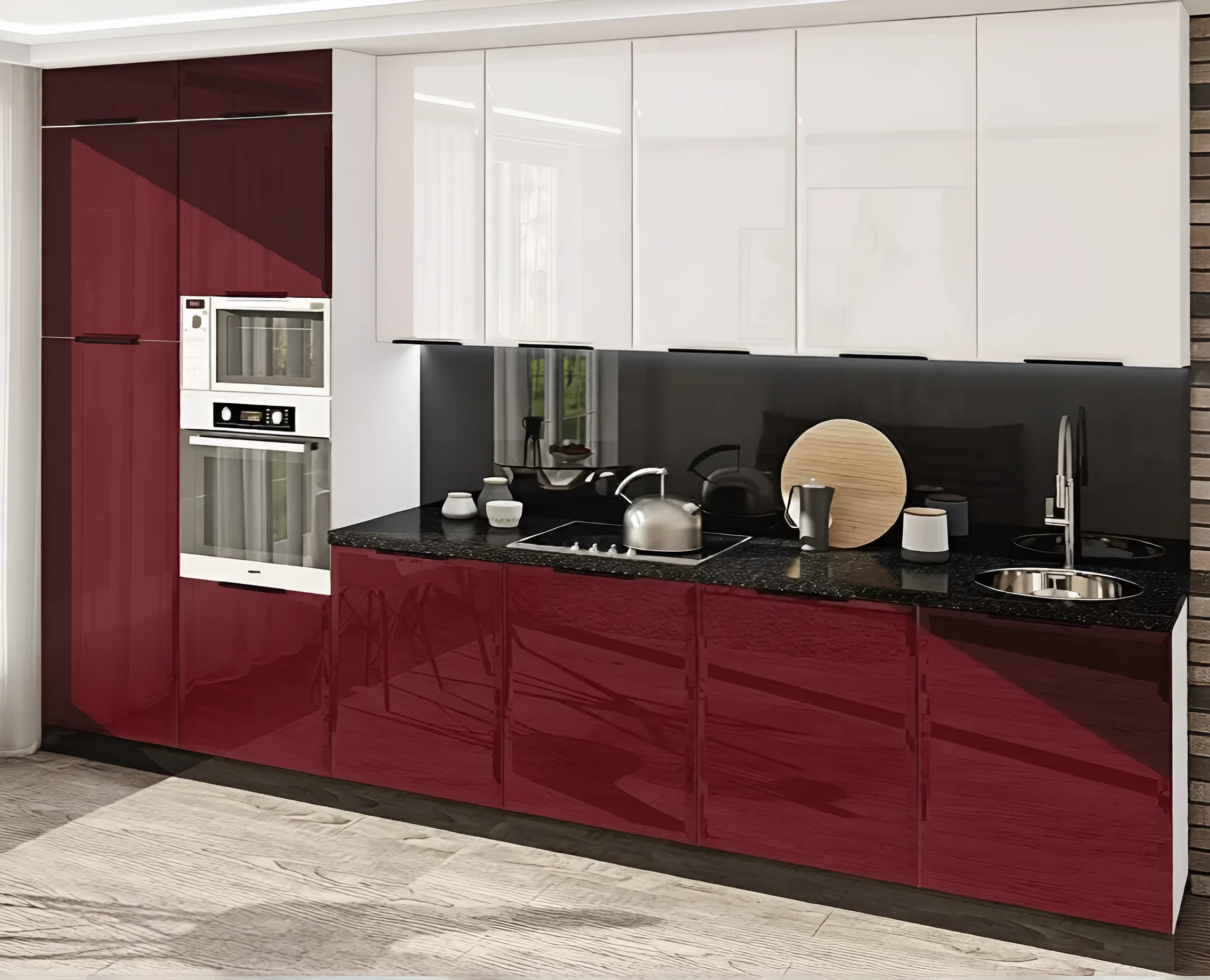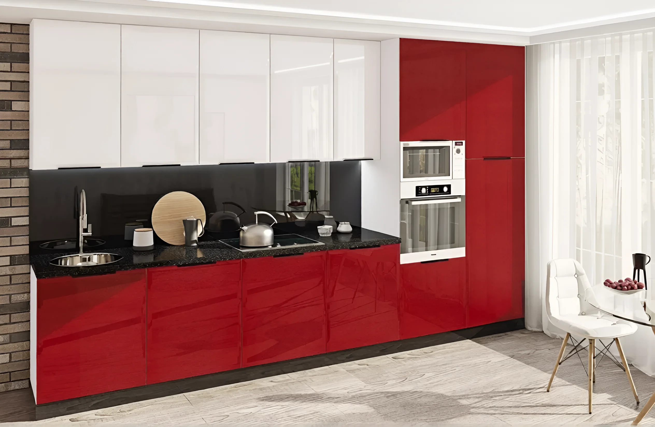 Фасады кухни выполнены из высококачественного МДФ, который известен своей прочностью, долговечностью и устойчивостью к влаге и перепадам температур. Покрытие фасадов – плёнка ПВХ с глянцевым эффектом. Этот материал обладает рядом преимуществ: он легко очищается от загрязнений, сохраняет свой первоначальный вид на долгие годы и устойчив к механическим повреждениям. Глянцевое покрытие придает кухне особую роскошь и глубину цвета, делая её по-настоящему выдающейся. Выбор цветов – Белый и Красный – не случаен: это классическое и всегда актуальное сочетание, которое не выйдет из моды и будет радовать вас своей яркостью каждый день.