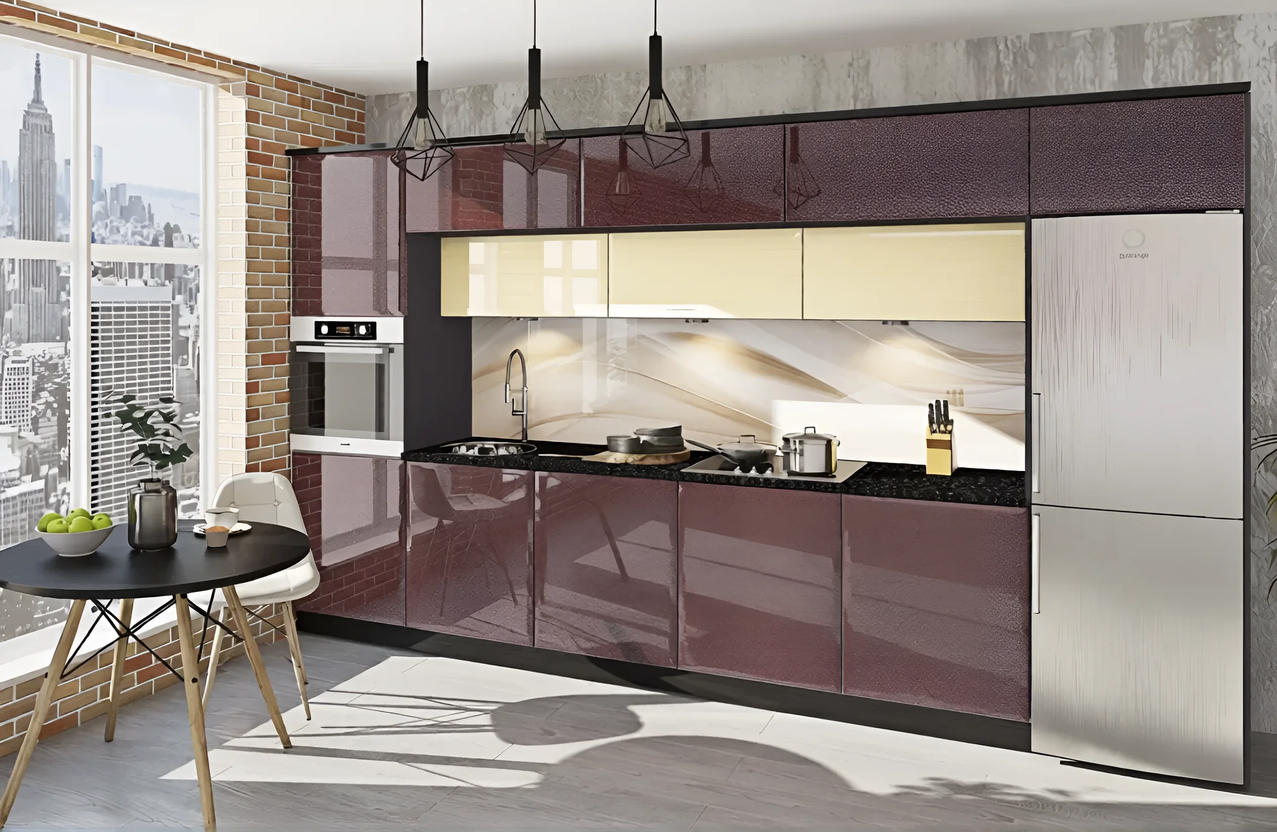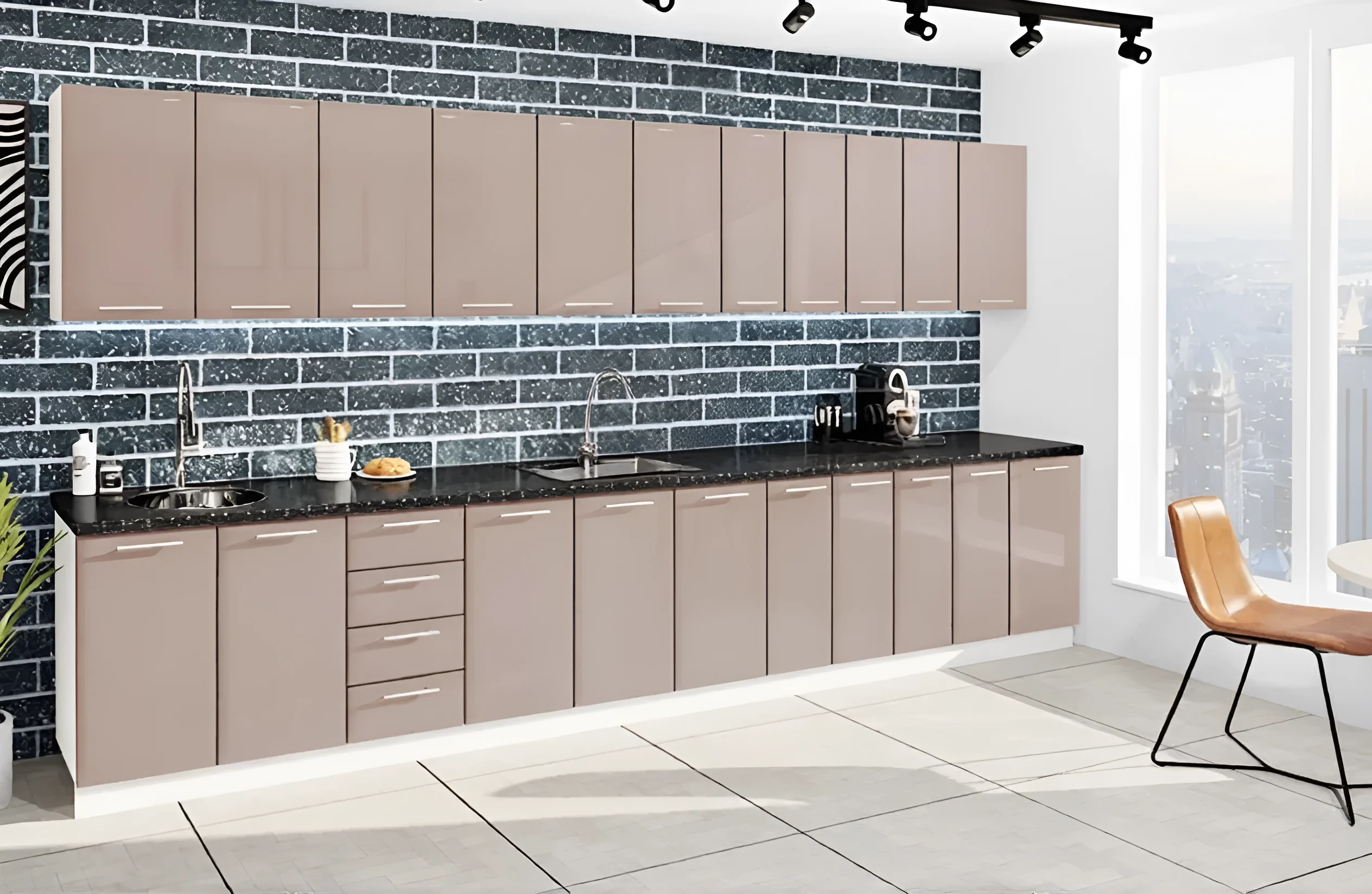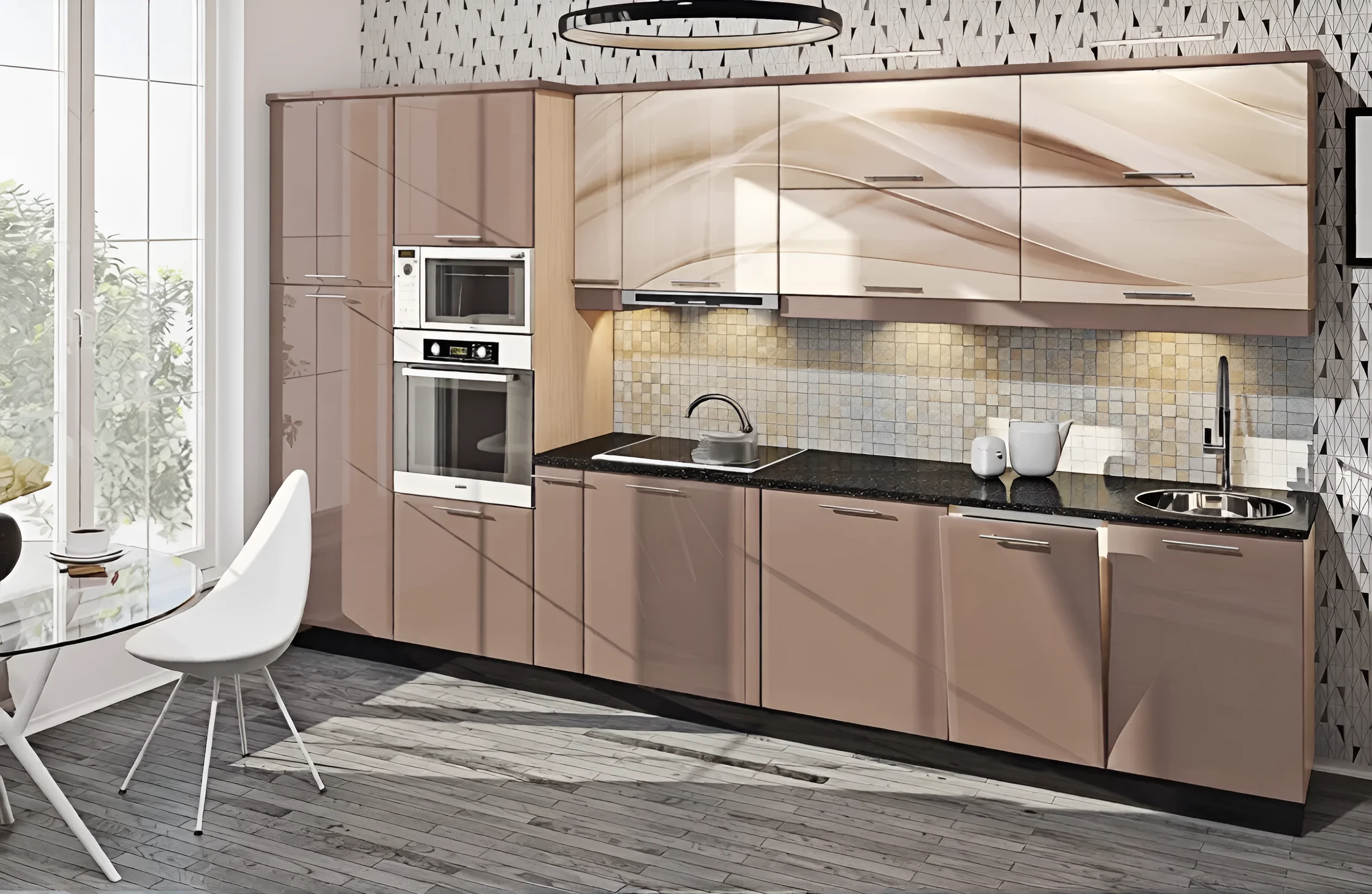 Серия «Хай-тек глянец» является воплощением минимализма, современности и элегантности. Фасады кухни выполнены из высококачественного МДФ, покрытого пленкой ПВХ с глянцевым эффектом. Этот выбор материала и покрытия не только придает поверхности благородный блеск и создает ощущение простора, но и обеспечивает легкость в уходе, а также устойчивость к влаге и перепадам температур, что крайне важно для кухонного пространства. Цветовое решение, сочетающее теплые и нейтральные тона Капучино и Лате, создает атмосферу спокойствия и уюта, при этом подчеркивая современный характер интерьера. Глянцевые поверхности отражают свет, визуально расширяя пространство и наполняя его воздухом. Эта кухня не просто мебель, это стильный акцент, который будет радовать глаз и служить источником вдохновения долгие годы.