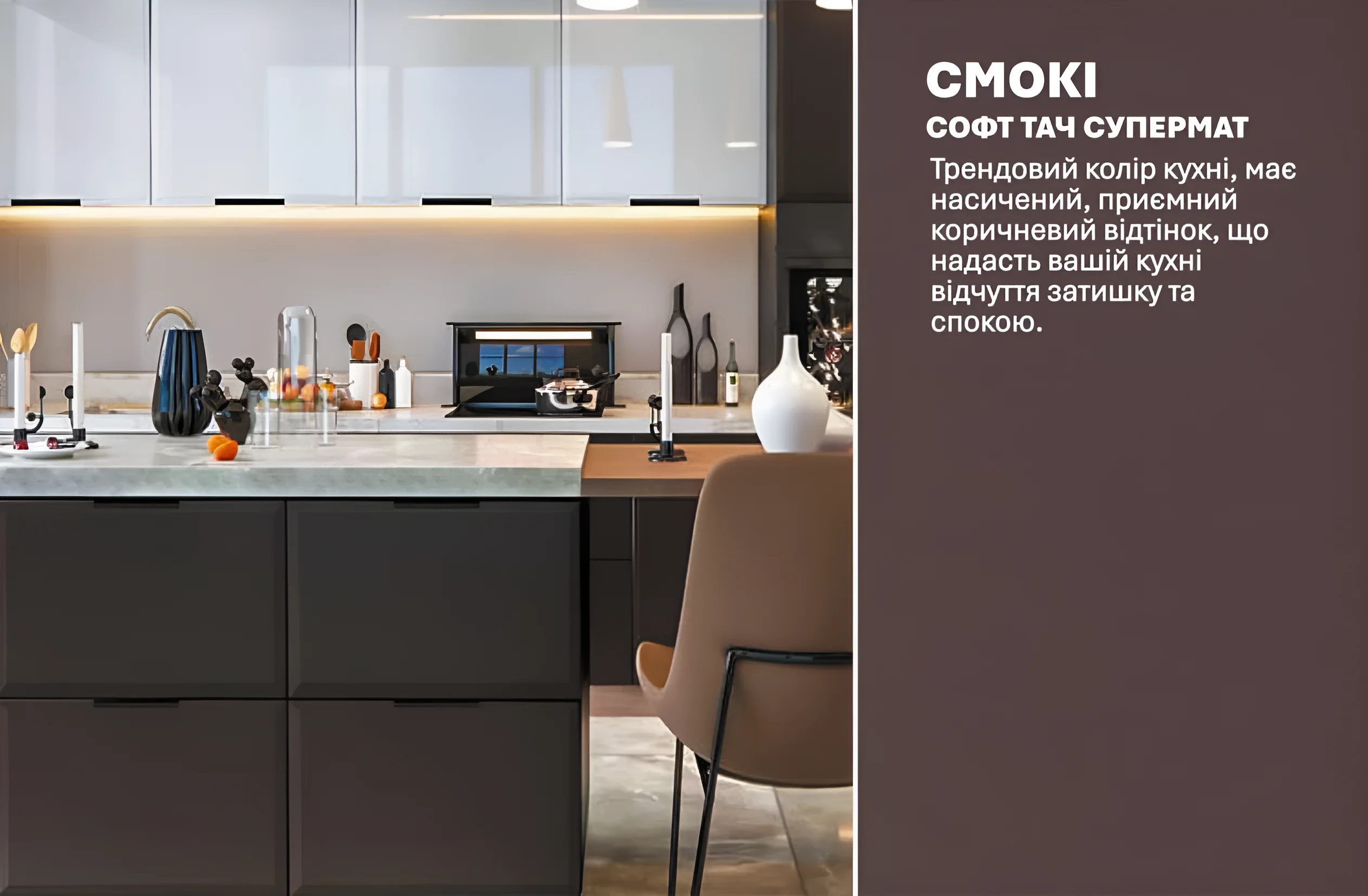 Дизайн данной кухни воплощает лучшие черты стиля хай-тек: строгие линии, минимализм, отсутствие лишних деталей и акцент на чистых формах. Цветовое решение — элегантное сочетание белого и оттенка «Смоки» — придает кухне особую изысканность и универсальность. Белый цвет фасадов верхних шкафов визуально расширяет пространство и придает ему легкость, а глубокий тон «Смоки» на нижних тумбах и высоких элементах придает интерьеру глубину и современный характер. Вы можете выбрать покрытие фасадов, идеально соответствующее вашим предпочтениям: ослепительный глянец для создания эффекта зеркальной поверхности и визуального увеличения пространства, или же ультрамодный софт тач супермат для фасадов, который не только приятен на ощупь, но и придает кухне благородный, спокойный вид, устойчивый к отпечаткам пальцев и мелким загрязнениям. Это позволяет создать поистине уникальное пространство, отражающее ваш индивидуальный вкус.