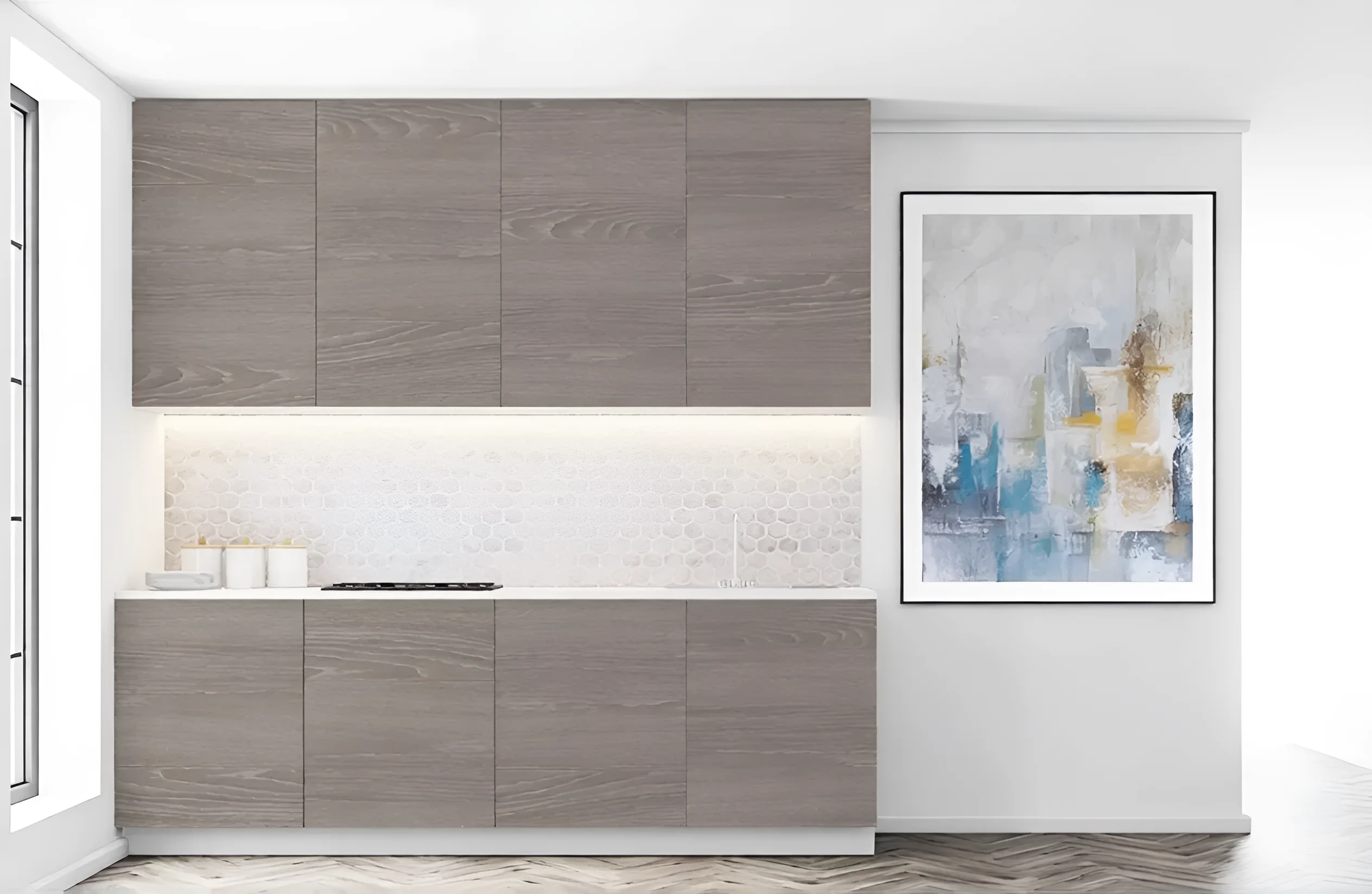 Кухня «Эко» спроектирована таким образом, чтобы максимально эффективно использовать каждый квадратный сантиметр вашей кухонной зоны. Общая длина кухни составляет 2400 мм (2,4 метра), что делает ее идеальным выбором для небольших квартир, студий или для тех, кто предпочитает минималистичные решения. Стандартная высота кухни в 2,15 м гармонично вписывается в большинство современных интерьеров, создавая ощущение простора и завершенности.