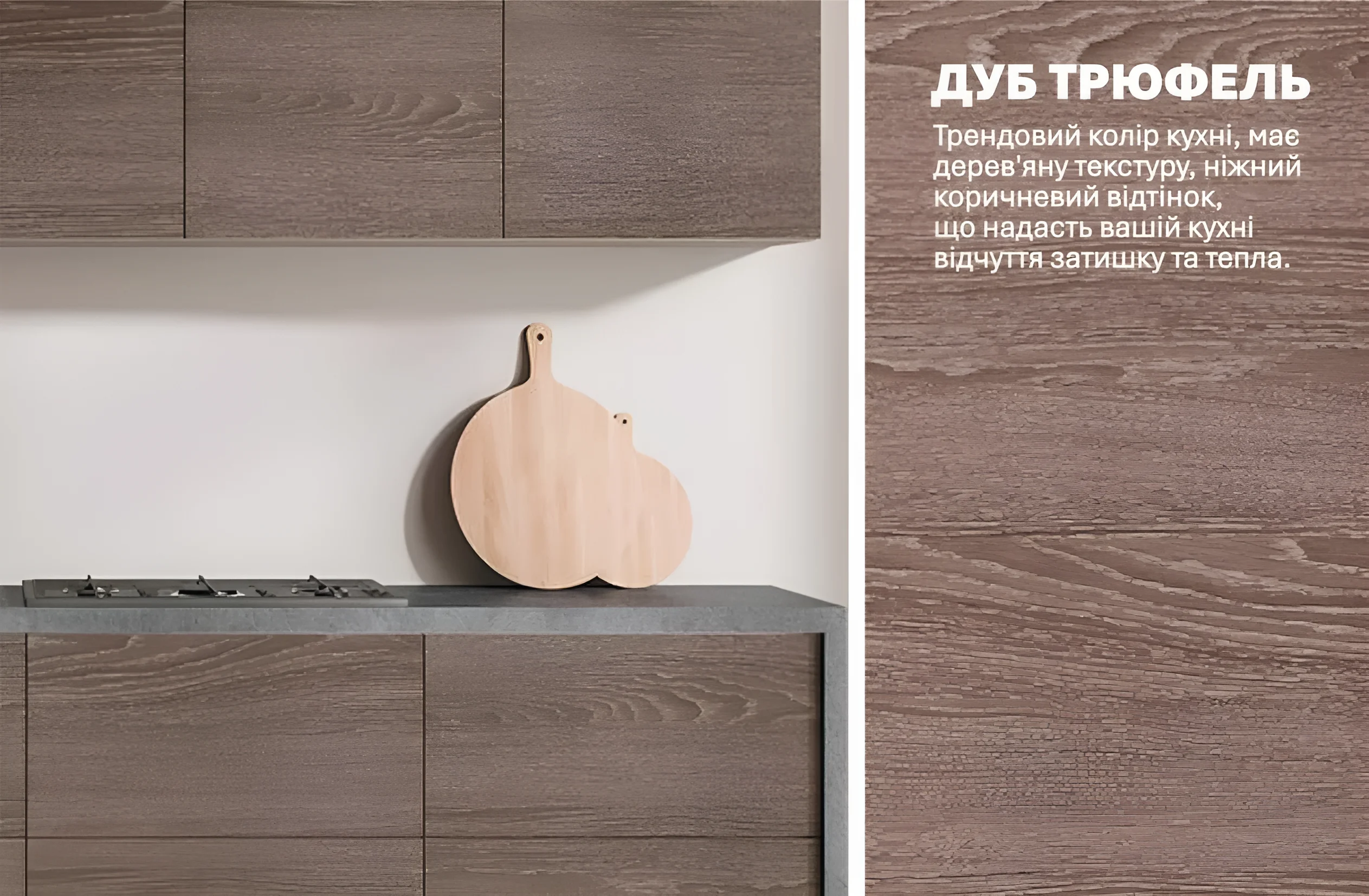 Цвет Дуб Трюфель – это не просто оттенок, это целая философия. Он придает кухне особую глубину и благородство, создавая уютную и теплую атмосферу. Этот универсальный цвет легко сочетается с различными элементами декора и цветовыми решениями в интерьере, позволяя вам экспериментировать и создавать уникальные пространства. Древесная текстура фасадов привносит в помещение природную гармонию и естественность, делая кухню не только местом для готовки, но и зоной отдыха.