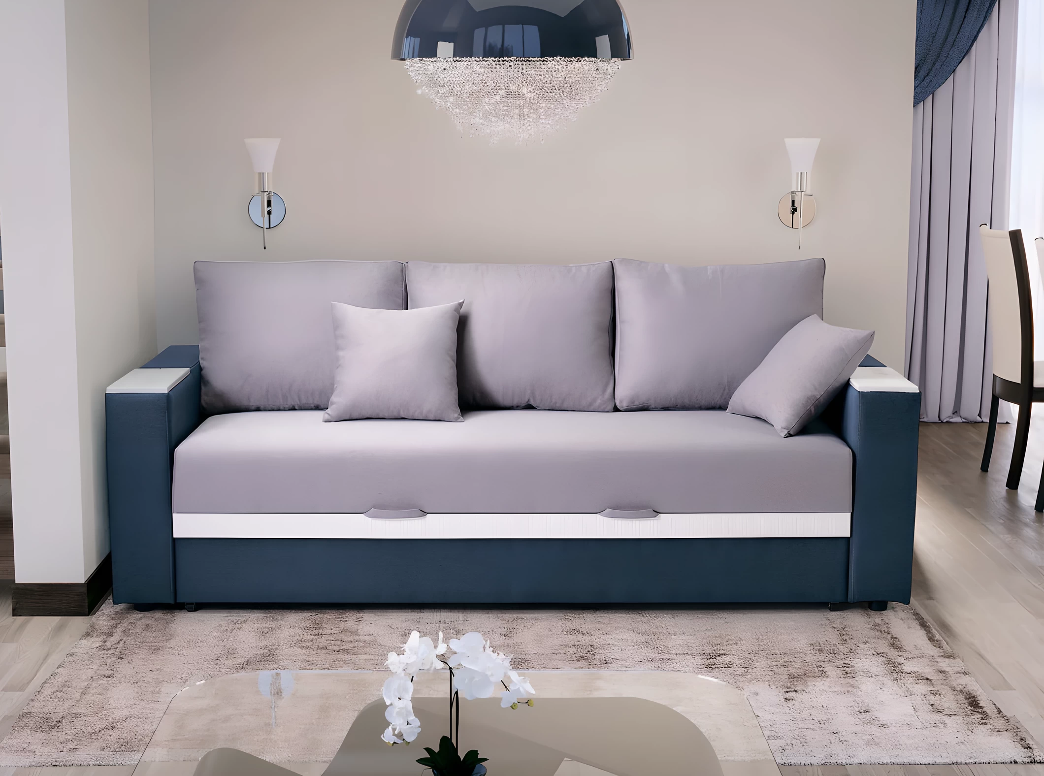 Прямой диван «Греция» — это не просто элемент интерьера, а полноценное сочетание уюта, стиля и продуманной функциональности. С первого взгляда внимание привлекает уникальный дизайнерский акцент — резные декоративные накладки на подлокотниках, выполненные в античном стиле, что сразу объясняет происхождение названия модели. Мягкая обивка из износостойкой ткани Victory Light Grey и Victory Navi от бренда Артекс обеспечивает приятные тактильные ощущения и стойкость к ежедневному использованию.