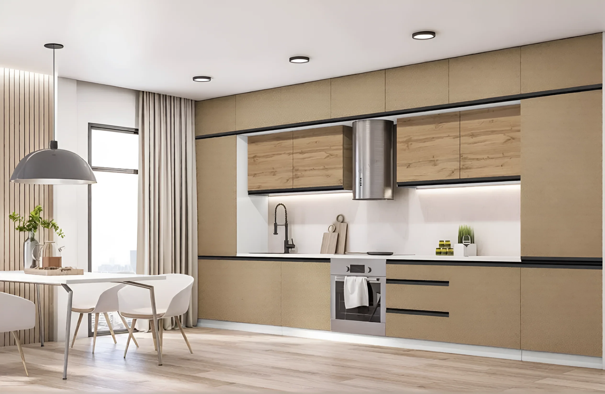 Дизайн кухни «Sigma ручка» разработан с учетом последних тенденций в мире интерьера. Сочетание теплого «Дуба золотого» и мягкого «Капучино» создает уютную и в то же время элегантную атмосферу. Эти натуральные и спокойные оттенки легко вписываются в любой современный стиль, будь то минимализм, сканди или лофт. Фасады кухни, выполненные из высококачественного МДФ, покрыты инновационной ПВХ-пленкой. Часть фасадов имеет приятное на ощупь покрытие «софт тач», которое придает поверхности бархатистость и особую глубину цвета, а также эффективно защищает от отпечатков пальцев, сохраняя безупречный внешний вид. Другие фасады отделаны текстурированной ПВХ-пленкой, добавляющей интерьеру динамики, тактильного разнообразия и имитирующей естественную структуру дерева. Такой подход к оформлению фасадов подчеркивает индивидуальность и современный характер кухонного гарнитура. Строгие линии и интегрированные ручки серии «Sigma ручка» идеально дополняют общую концепцию, придавая кухне законченный и стильный вид без лишних деталей.