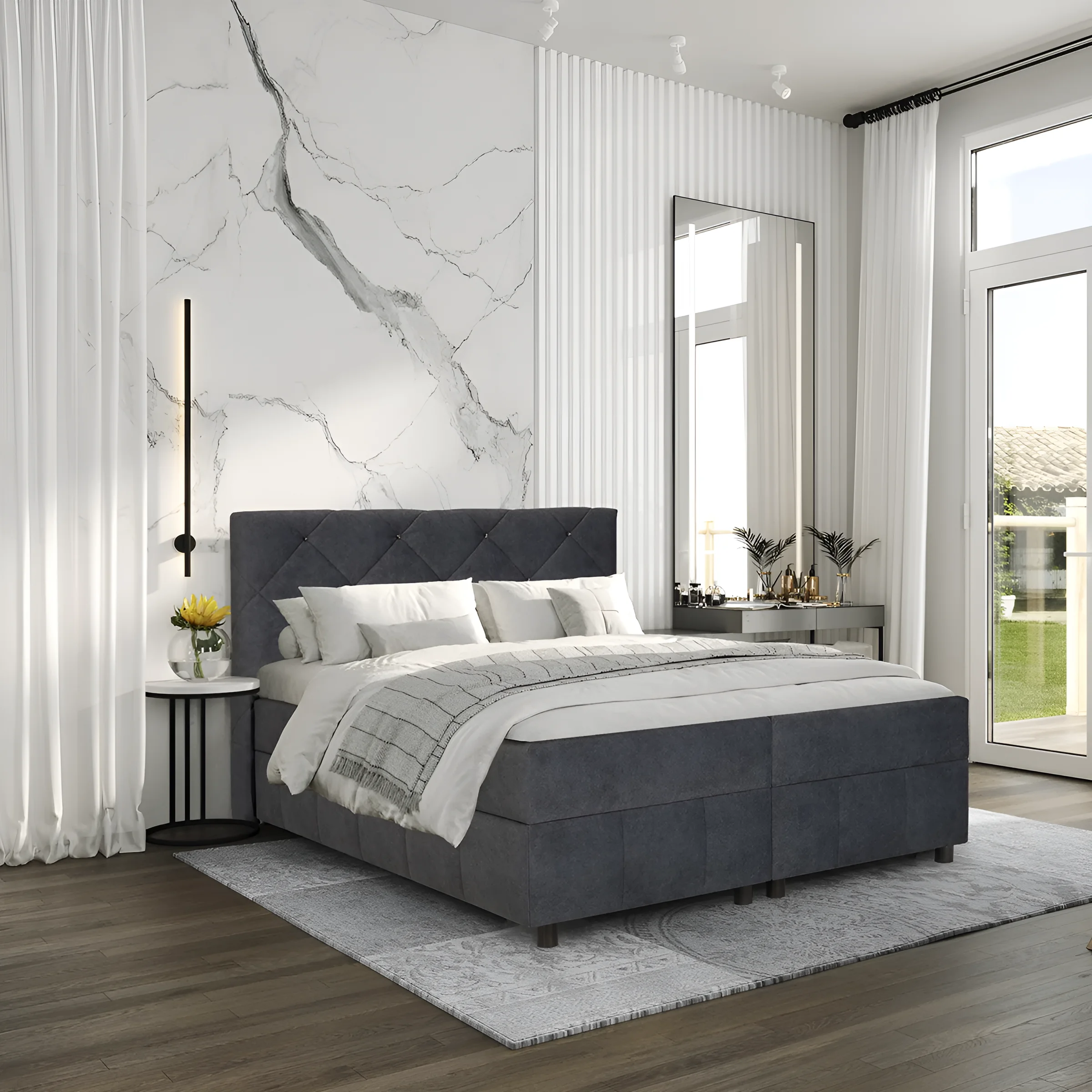 Спальная система Dorothy 160×200 воплощает в себе элегантность и утонченность. Высокое мягкое изголовье с эффектной ромбовидной стежкой является визитной карточкой этой модели. Такая стежка не только придает кровати изысканный вид, но и обеспечивает дополнительный комфорт. Обивка выполнена из высококачественного мебельного велюра или аналогичной ткани, которая приятна на ощупь, устойчива к износу и легка в уходе. Этот материал придает кровати глубину цвета и роскошный вид, подчеркивая ее статус.