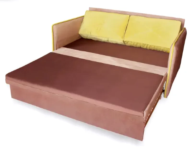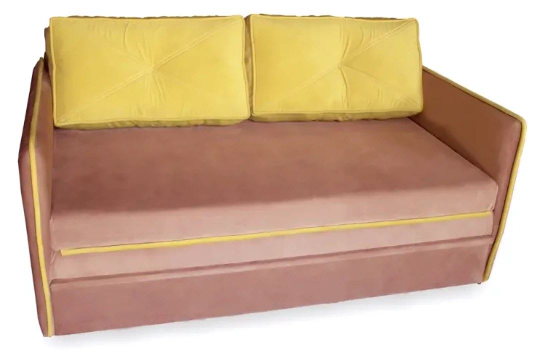 Тахта София приковывает взгляд своим современным и игривым дизайном. Ее пыльно-розовая обивка из мягкого велюра или рогожки (в зависимости от выбора) эффектно дополнена яркими желтыми кантами и подушками, создавая смелый и гармоничный цветовой контраст. Это не просто диван, а настоящий арт-объект, который:
