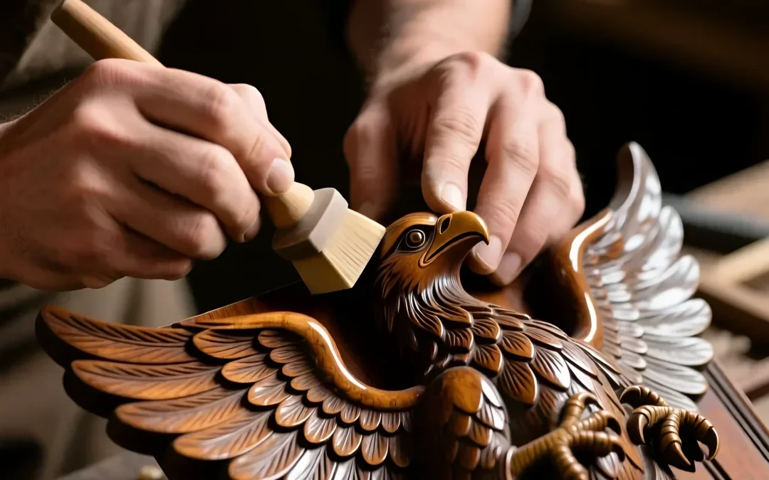 Фотография демонстрирует процесс бережной реставрации ретро-серванта. В центре внимания – сложная резьба по дереву, изображающая орла, выполненную с высоким мастерством. Композиция акцентирует внимание на руках мастера и детализации орнамента, создавая ощущение тактильности и уважения к предмету старины. Теплые тона дерева и мягкий свет подчеркивают благородство материала и ценность ручной работы. Фотография вызывает ассоциации с историей, традициями и заботой о сохранении культурного наследия.