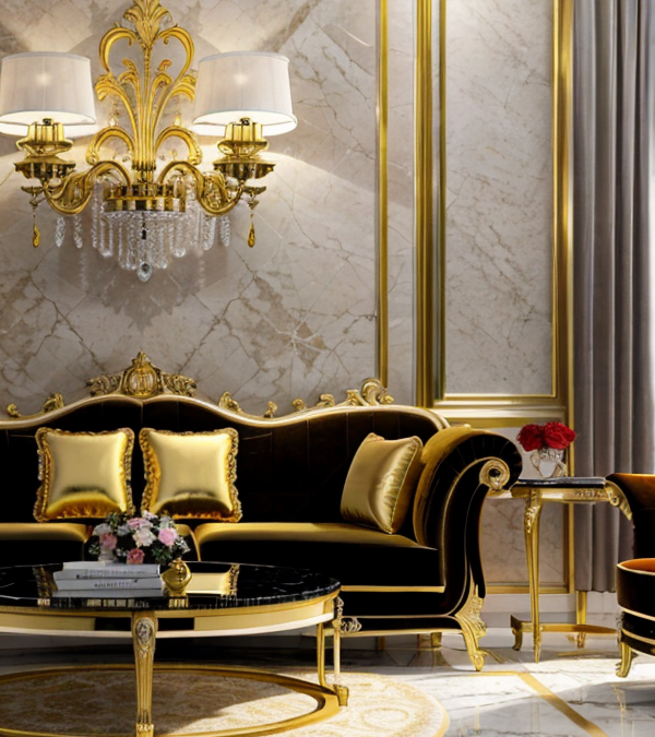 Тренды дизайна гостиной 2025 Luxurious living room with plush velvet furniture, metallic gold accents, marble coffee table, and warm ambient lighting, photor mebeltops.com 016