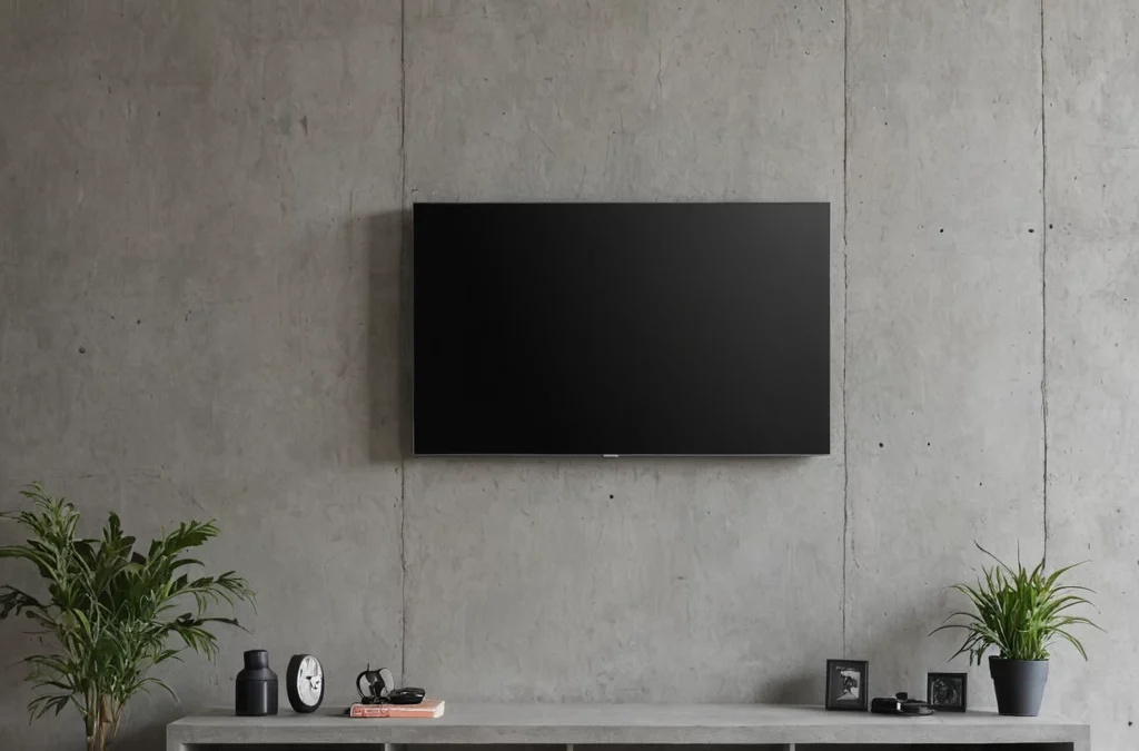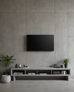 photorealistic, a concrete TV unit, raw and industrial aesthetic, minimalist living room №06 — mebeltops.com