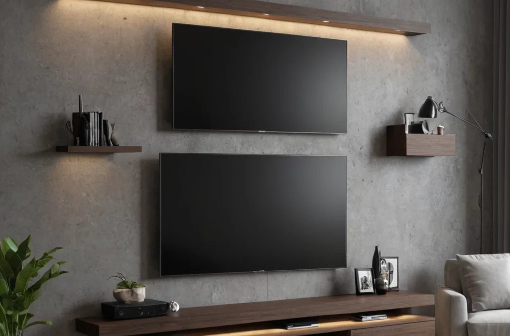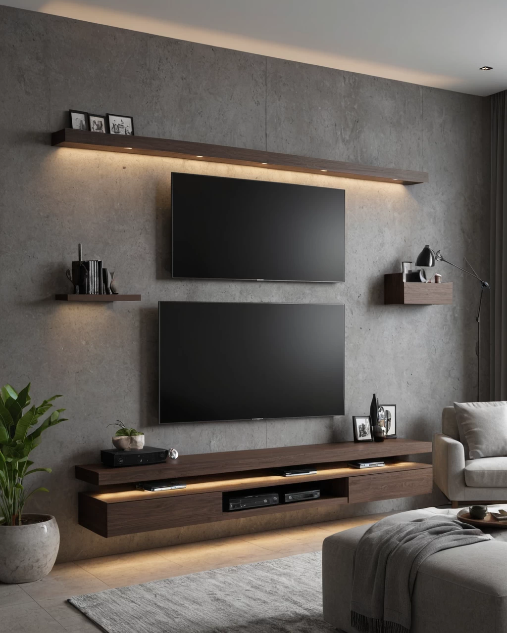 photorealistic, floating TV unit, wall mounted, dark wood, LED strip lighting underneath, against a concrete wall, contemporary №34 — mebeltops.com
