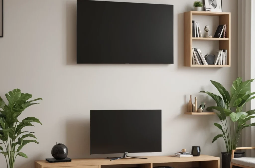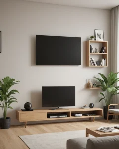 photorealistic, open shelving TV bench, showcasing decorative items and media, minimalist and airy №40 — mebeltops.com