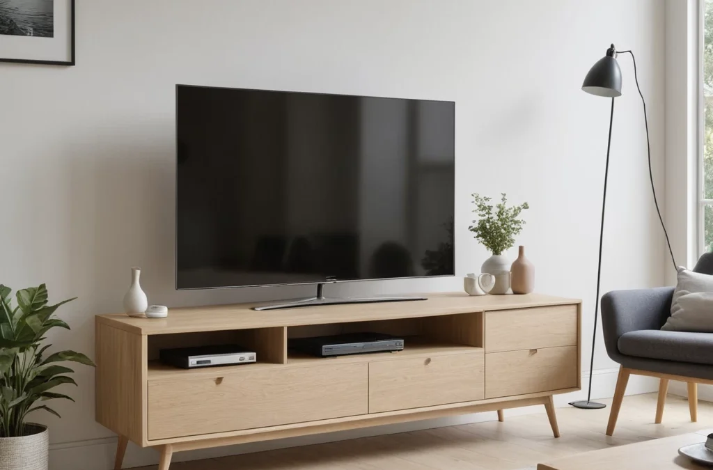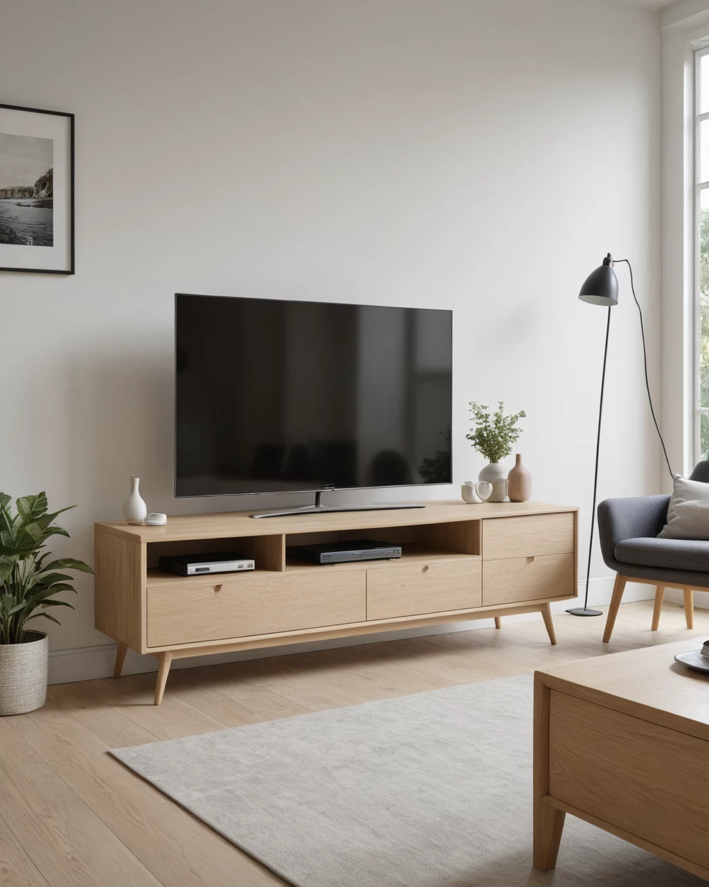photorealistic, Scandinavian TV cabinet, light oak, simple drawers, integrated cable management, bright and airy living room №42 — mebeltops.com