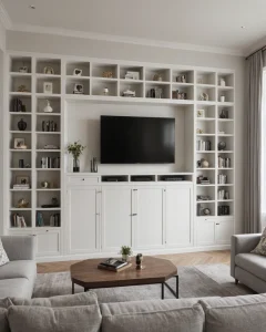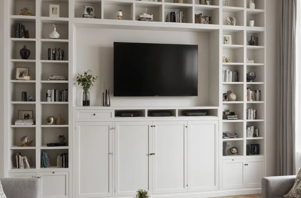 photorealistic, wall to wall TV unit, custom built in, multiple storage compartments, seamless design, elegant living room №50 — mebeltops.com