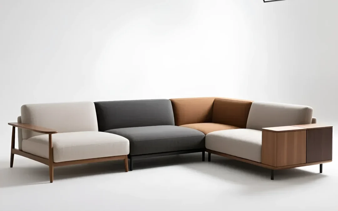 Представлен модульный угловой диван, выполненный в современном минималистичном стиле с элементами Mid-Century Modern. Конструкция состоит из нескольких секций с разной обивкой (светло-бежевый, графитовый, терракотовый), объединенных общим низким деревянным каркасом и тонкими черными ножками. Диван имеет асимметричную форму, а один из торцов дополнен встроенным деревянным приставным столиком-хранилищем.