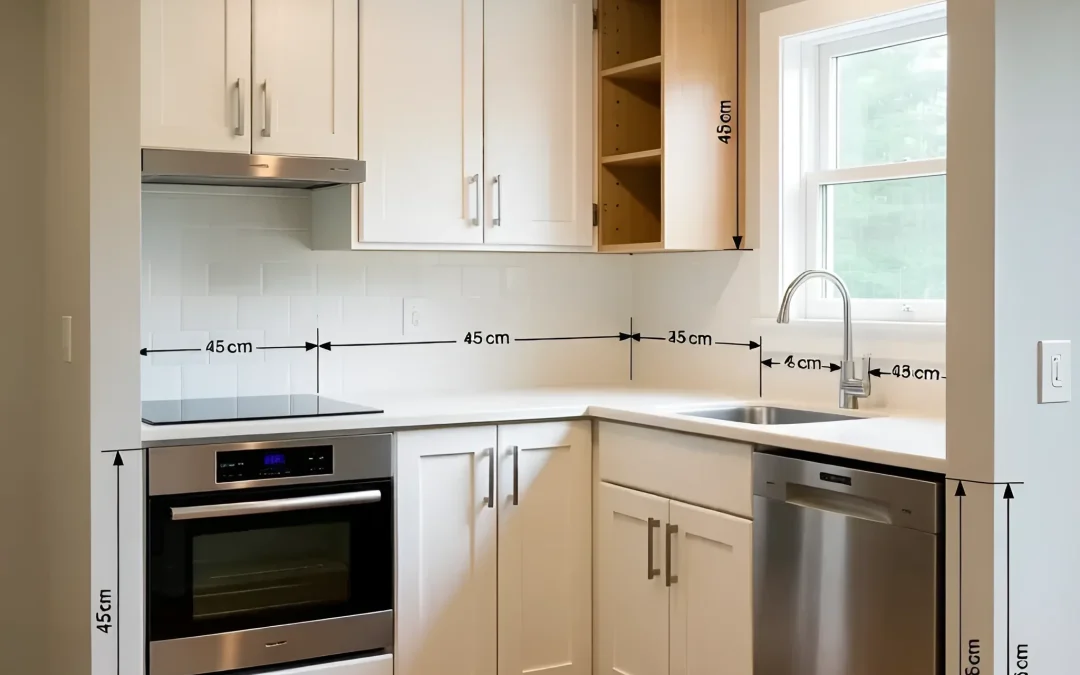 Данная компоновка спроектирована для максимальной эффективности на небольшой площади за счет углового расположения, оптимизируя рабочие зоны (мойка, варочная поверхность). Встроенная техника (духовой шкаф 45 см) экономит место, а глубина шкафов 45 см позволяет комфортно перемещаться в проходе. Открытая ниша служит для быстрого доступа к нужным предметам или для визуального облегчения массивности верхнего ряда.