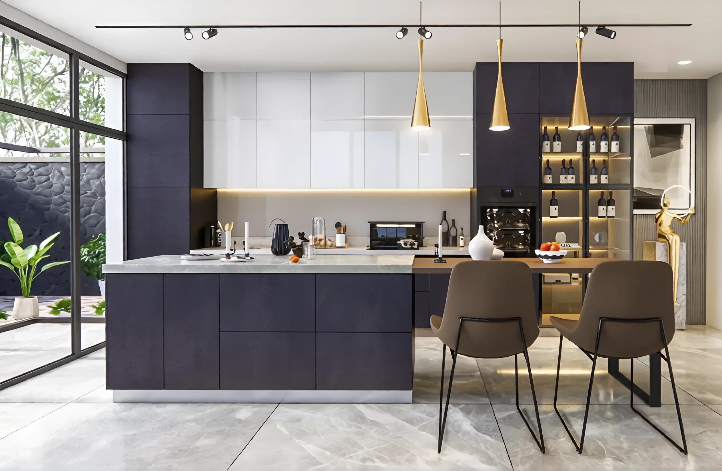 Пряма конфігурація кухні довжиною 4 метри дозволяє оптимально організувати робочу зону, забезпечуючи легкий доступ до всіх необхідних елементів. Додатковим акцентом і центральним елементом є кухонний острів, який не тільки розширює робочу поверхню, але й служить ідеальним місцем для неформальних сніданків, кава-брейків або спілкування з близькими під час приготування їжі. Дизайн “до стелі” з антресолями (загальна висота кухні 2,5 метра) не тільки виглядає ефектно, але й забезпечує максимальне використання вертикального простору, дозволяючи зберігати все необхідне, не захаращуючи приміщення.