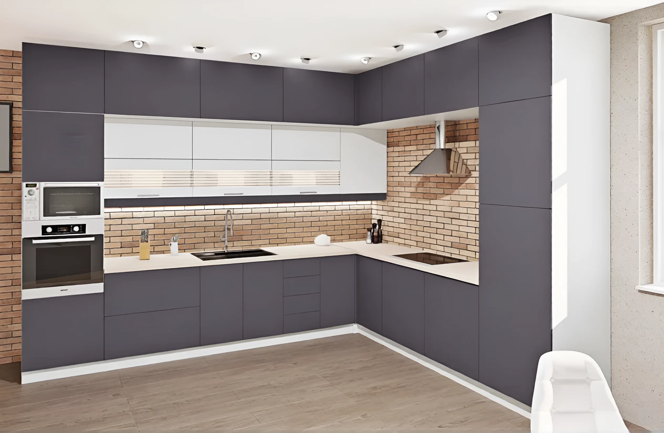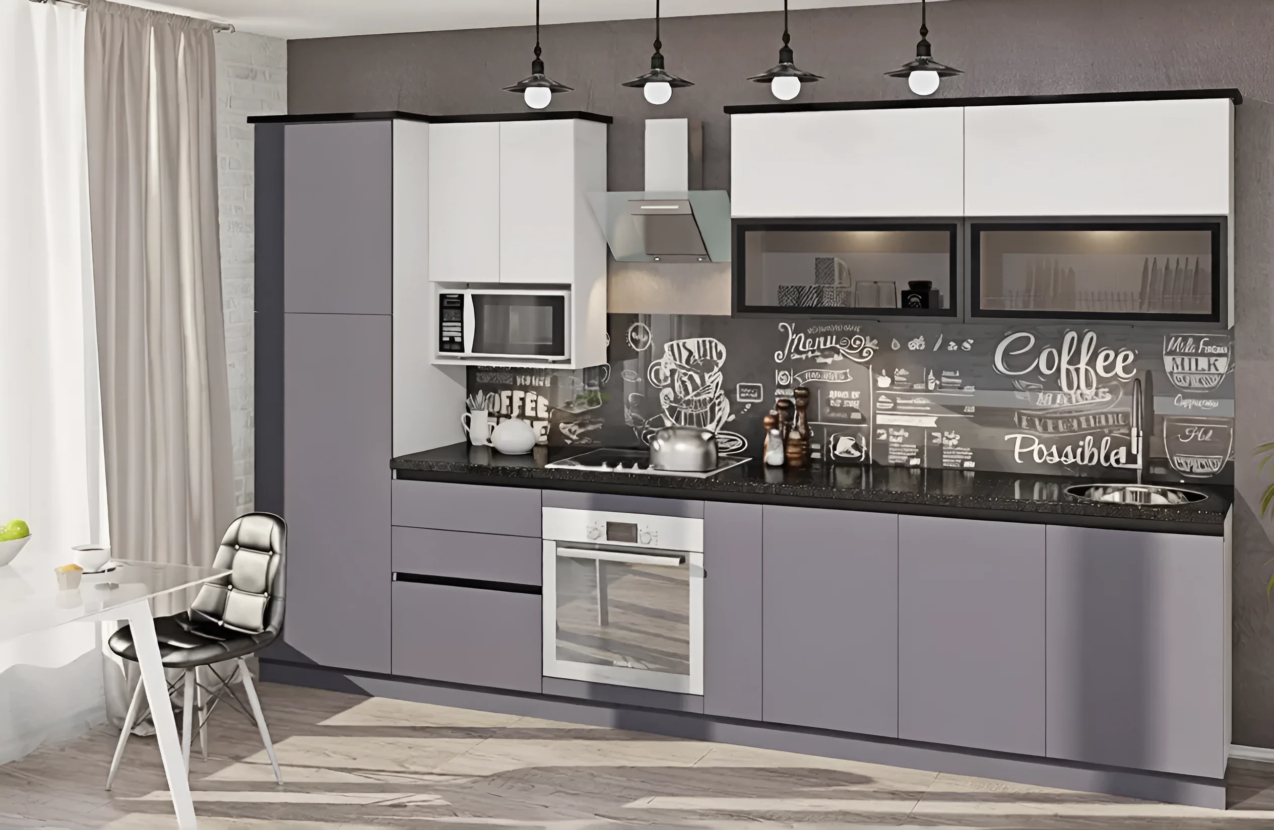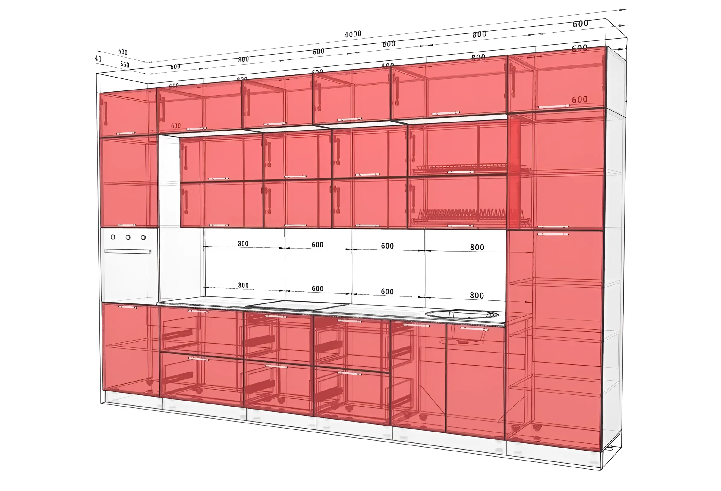 Висота верхніх шаф продумана з урахуванням різних потреб: доступні варіанти в 1080 мм і 1280 мм. Це дозволяє вибрати оптимальне рішення для зберігання, від великогабаритного посуду до дрібного кухонного приладдя. Висота кухні в 2,5 метра, з використанням антресолей, виключає скупчення пилу на верхніх поверхнях і забезпечує додатковий простір для рідко використовуваних предметів. Стандартна глибина нижніх тумб (450 мм) і стільниці (600 мм) гарантує комфортну роботу, зручне розміщення вбудованої техніки та легкий доступ до всього вмісту шаф.