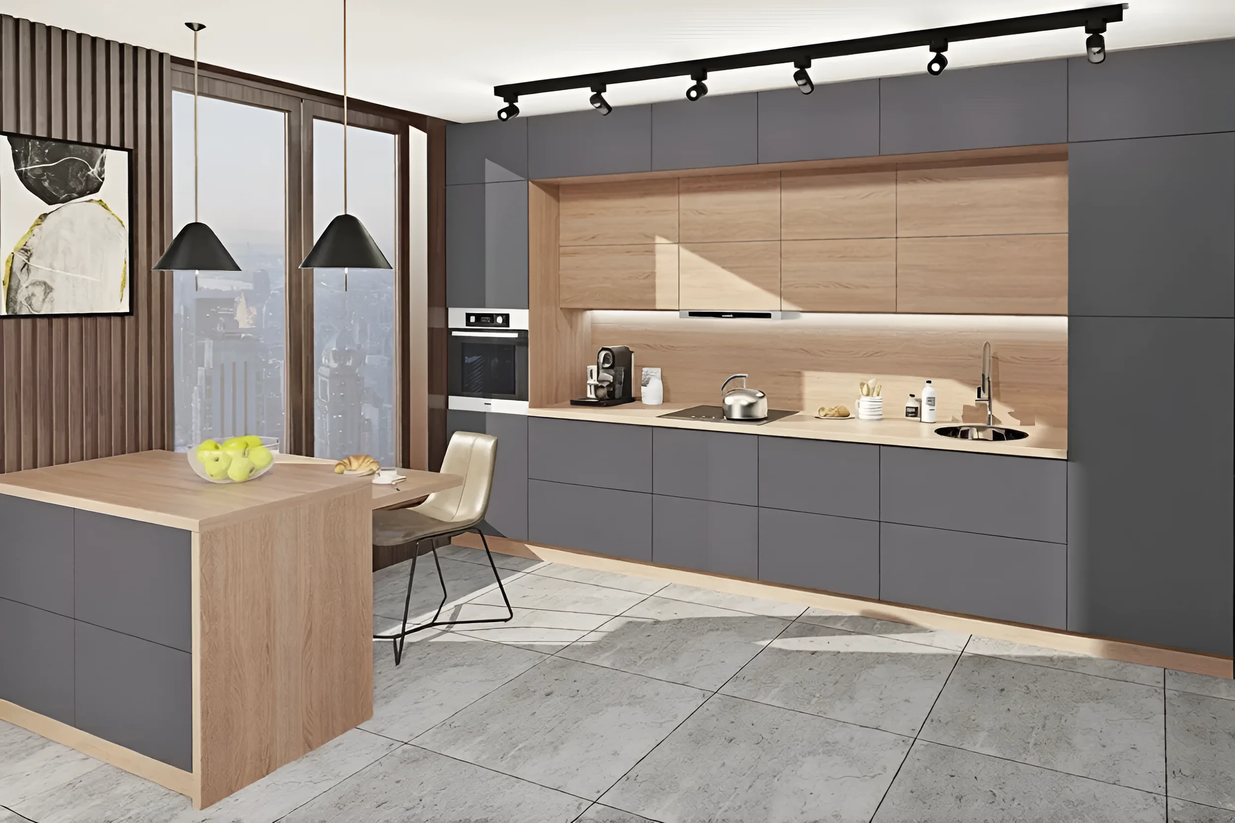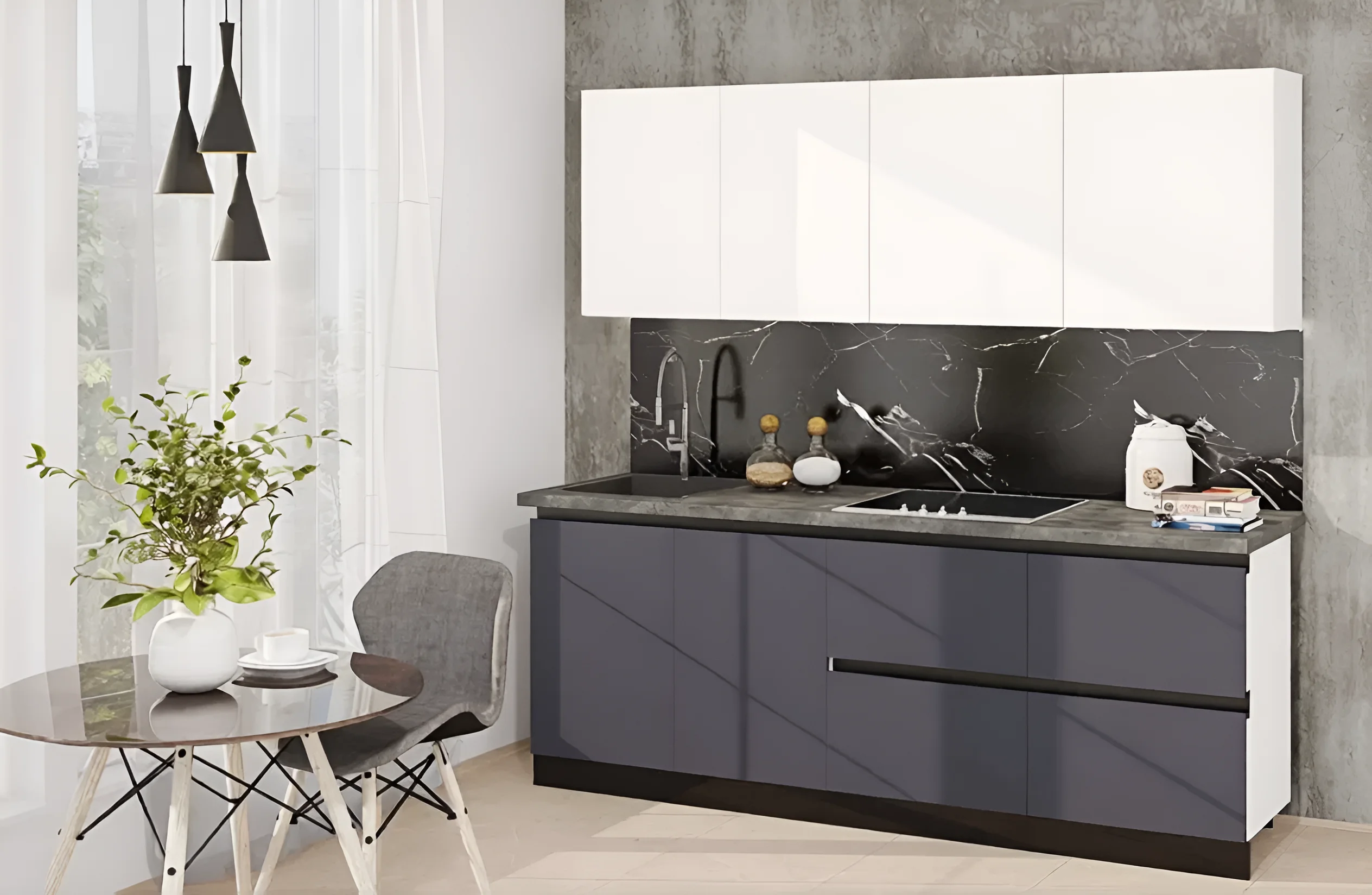Представляємо вам сучасну та функціональну пряму кухню “Еко” довжиною 4 метри, оснащену стильним кухонним островом. Ця модель – ідеальне рішення для тих, хто цінує гармонію, практичність та актуальний дизайн. Поєднання благородного відтінку Графіт та теплого, затишного Дуба Сонома створює унікальний інтер’єр, який стане серцем вашого дому. Кухня “Еко” розроблена для максимального комфорту та ефективності, пропонуючи продуманий простір для приготування їжі, зберігання та сімейних посиденьок.