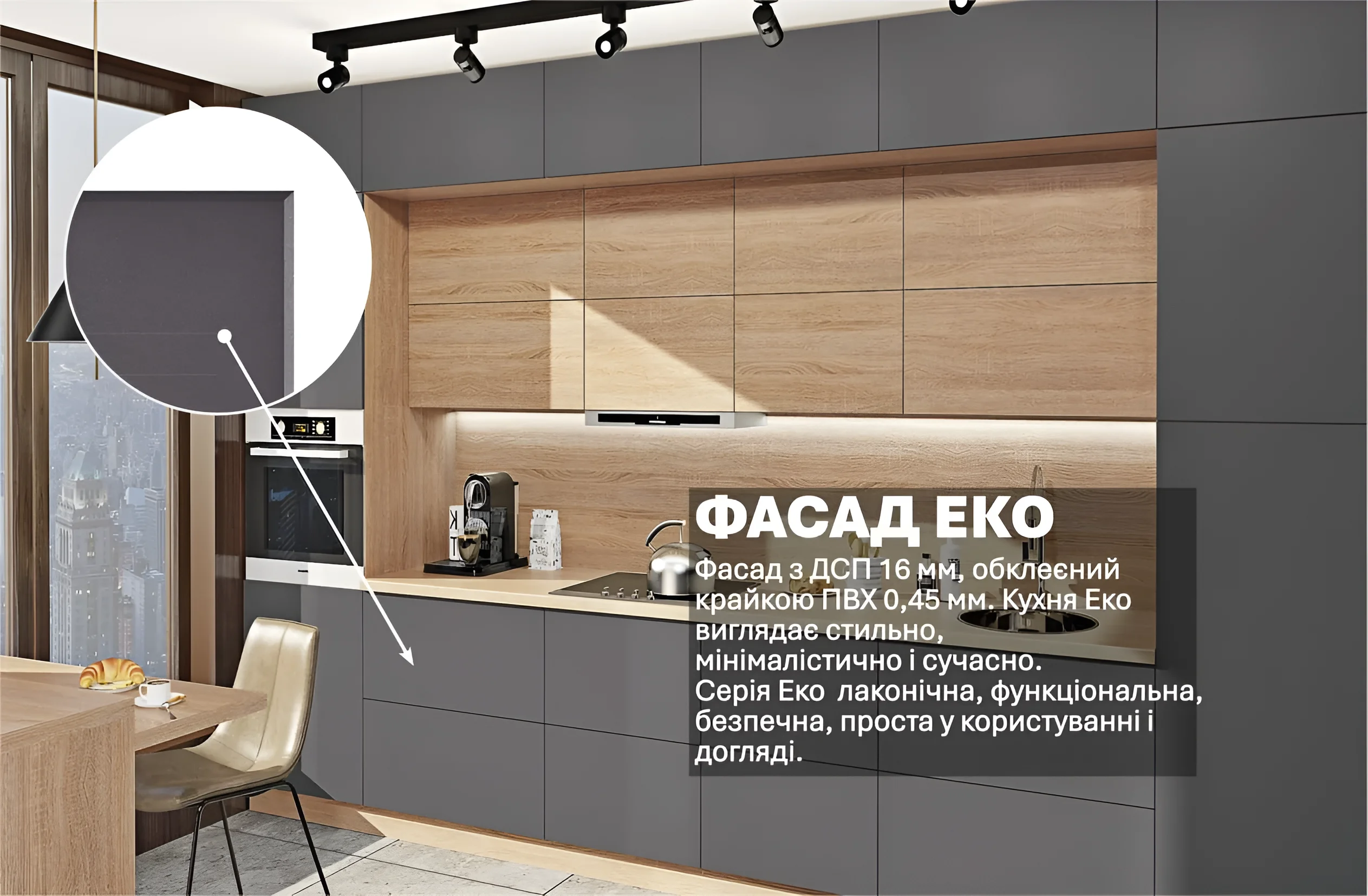 Покриття фасадів стійке до вологи, перепадів температур і механічних впливів, що особливо важливо для кухонних меблів. Воно легко чиститься, зберігаючи свій первісний вигляд на довгі роки. Вибираючи кухню “Еко”, ви інвестуєте в надійність, якість і комфорт, які будуть радувати вас щодня.