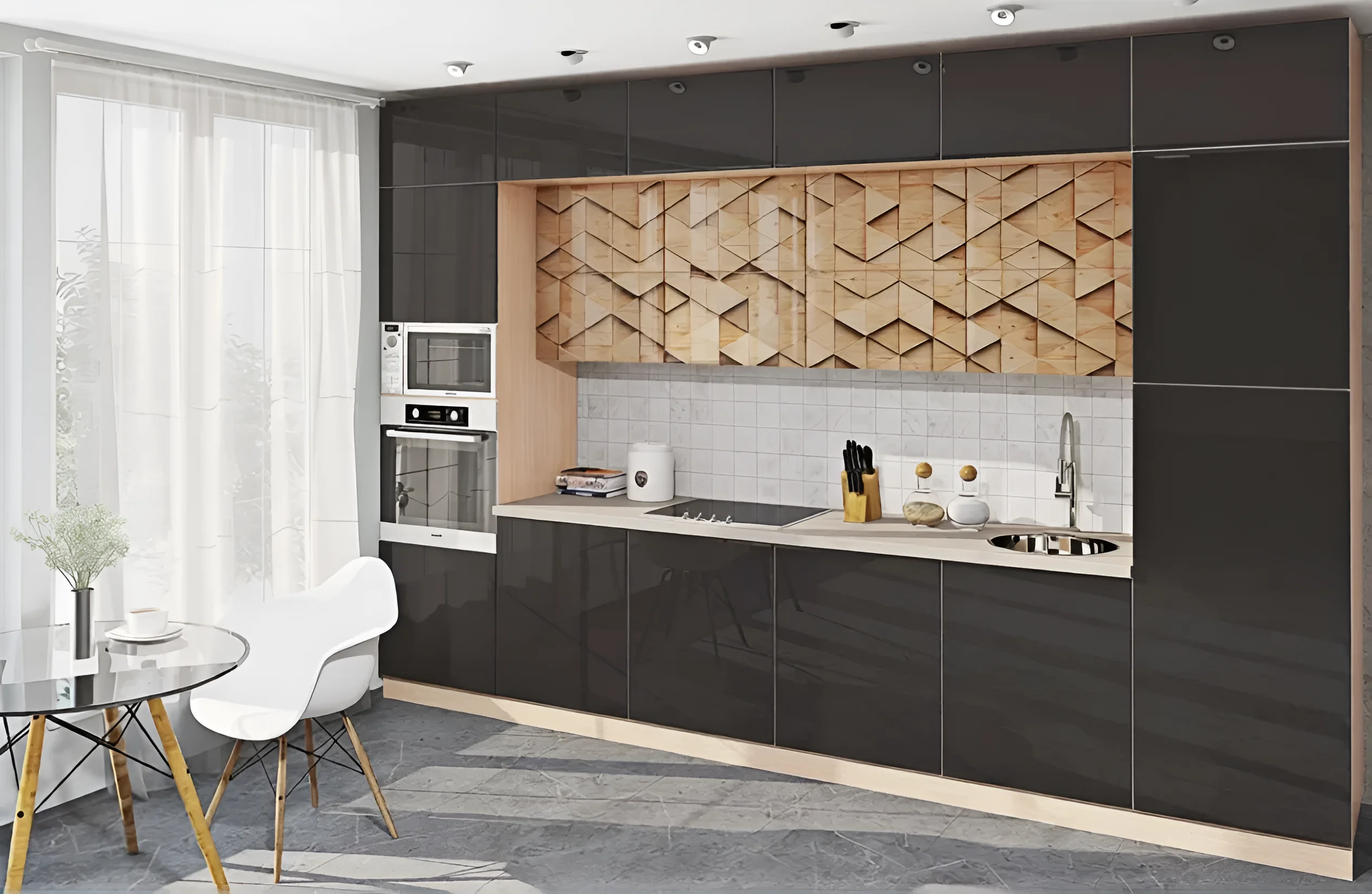 Кухня “Хай-тек з кольоровим друком” – це уособлення сучасного мінімалізму та функціональності, притаманних стилю хай-тек. Глянцеві фасади кольору Асфальт створюють ефект глибини та візуально розширюють простір, відбиваючи світло та додаючи приміщенню блиску. Цей відтінок не тільки практичний, але й неймовірно елегантний, він слугує чудовим фоном для кухонної техніки та декору. Центральним елементом дизайну є оригінальний кольоровий друк, який може бути виконаний за вашим індивідуальним замовленням, що дозволяє створити по-справжньому унікальний інтер’єр, який відображає ваш смак та характер. Ця серія також доступна у класичному Хай-тек глянцевому виконанні, що дає вам ще більше можливостей для вибору.