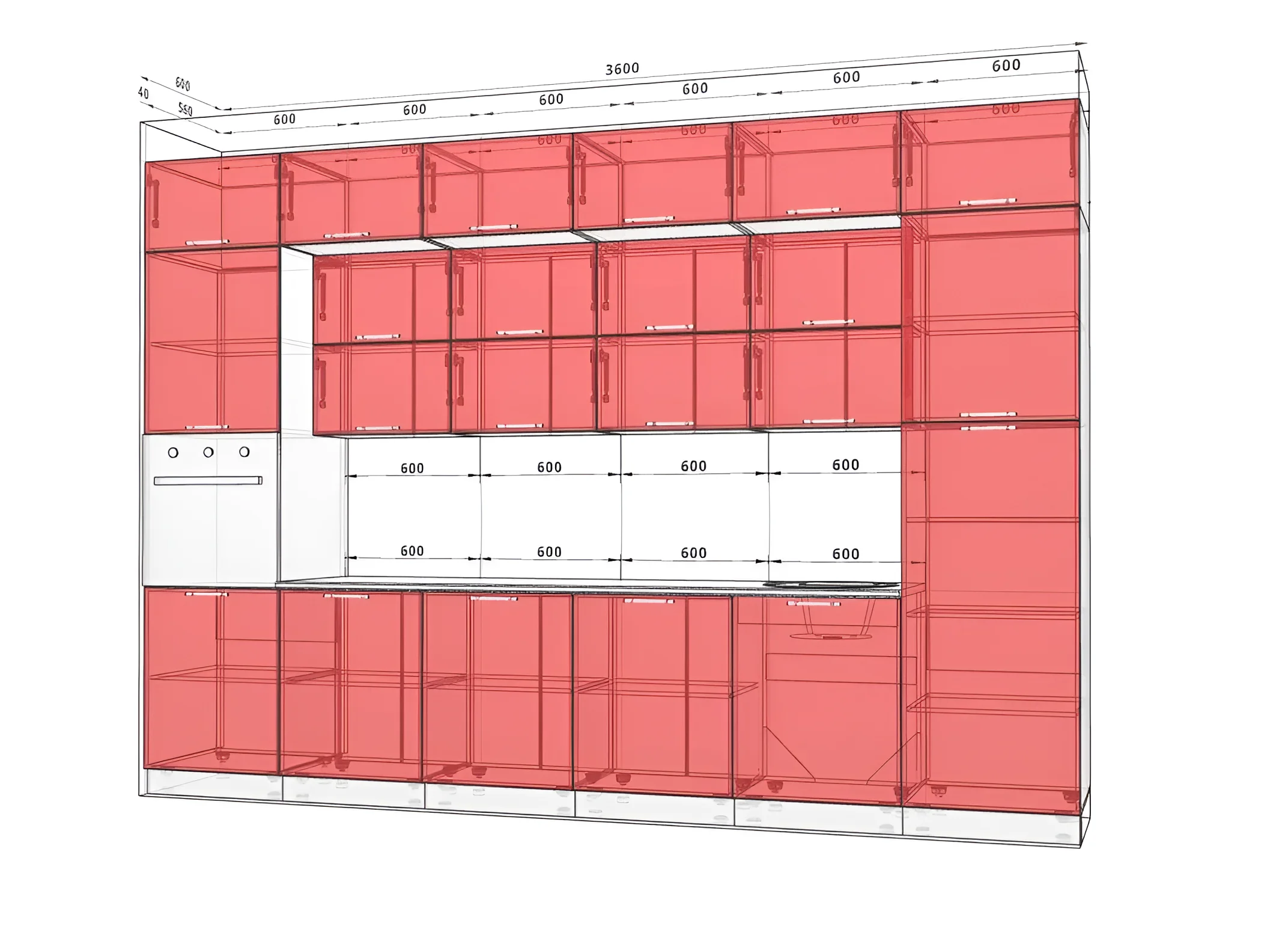 Однією з ключових переваг цієї кухні є її продумана висота. Кухня під стелю висотою 2,5 метра з антресолями максимально ефективно використовує кожен сантиметр вертикального простору. Це рішення ідеально підходить для зберігання рідко використовуваного посуду, дрібної побутової техніки або запасів продуктів, звільняючи нижні ящики та полиці для предметів першої необхідності. Висота верхніх шаф варіюється – доступні варіанти 1080 мм та 1280 мм, що дозволяє адаптувати кухню під індивідуальні потреби та зріст користувачів. Загальна довжина кухні 3,6 метра забезпечує достатньо робочої поверхні та місць для зберігання, роблячи процес приготування їжі комфортним та приємним. Глибина нижніх тумб становить стандартні 450 мм, забезпечуючи зручний доступ до вмісту, а стільниця глибиною 600 мм надає простору та комфортну робочу зону.