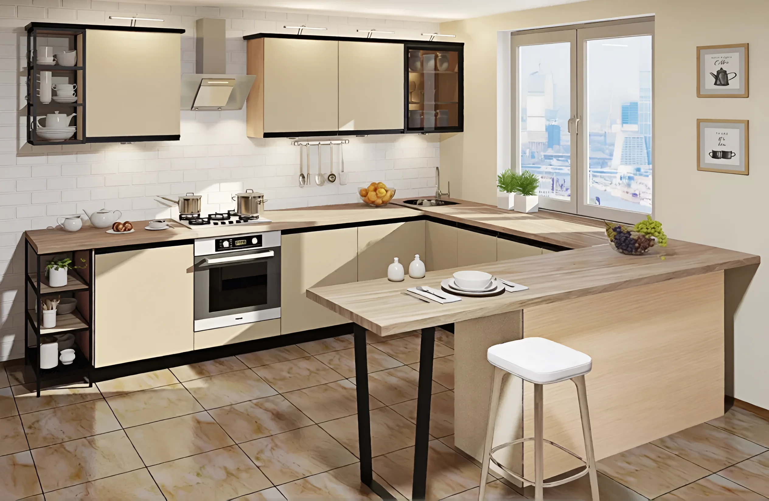 Продуманість кожної деталі – ключ до зручності в повсякденній експлуатації. Стандартна висота кухні в 2,15 метра забезпечує комфортний доступ до всіх елементів як для високих, так і для невисоких користувачів. Довжина в 5,4 метра гарантує велику кількість робочих поверхонь і місце для вбудованої техніки, дозволяючи організувати функціональний “робочий трикутник”. Верхні шафи пропонуються у двох варіантах висоти: 720 мм і 920 мм, що дозволяє максимально використовувати вертикальний простір і адаптувати гарнітур під індивідуальні вподобання та висоту стель. Нижні тумби мають стандартну глибину 450 мм, забезпечуючи зручне зберігання посуду та начиння, а стільниця глибиною 600 мм надає достатньо місця для кулінарних експериментів та розміщення дрібної побутової техніки.