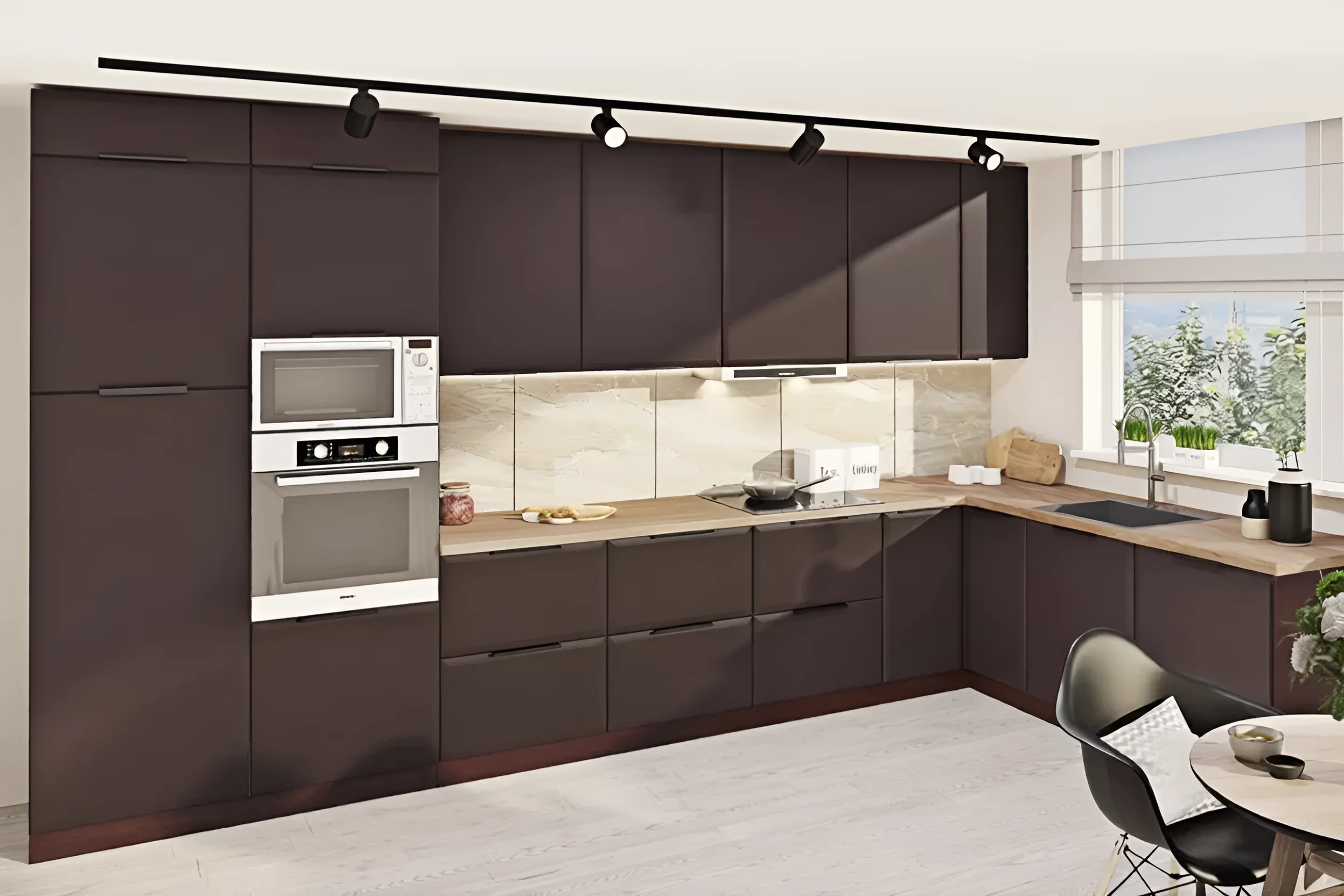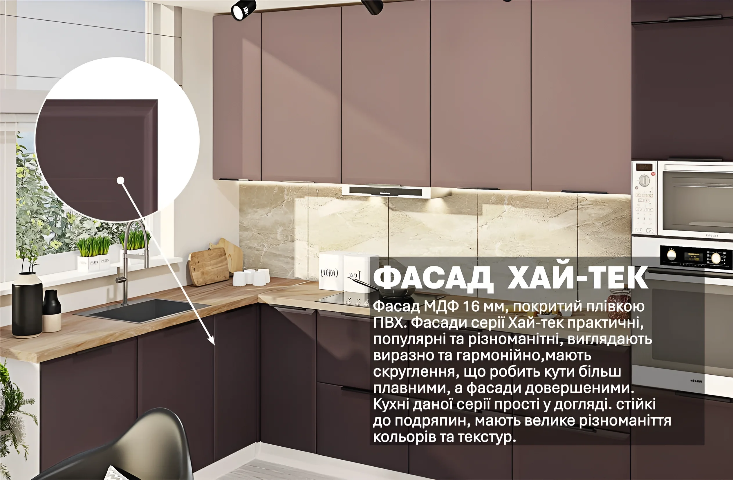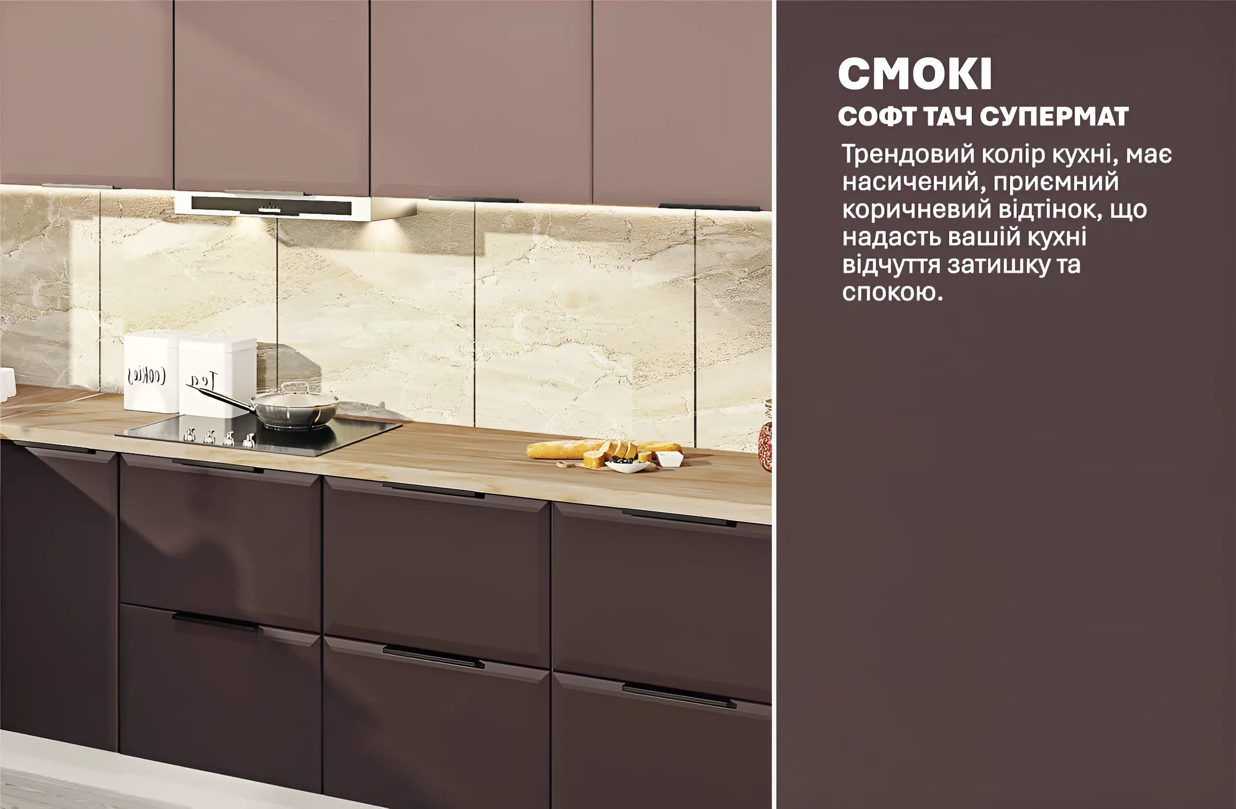 Дизайн кухні “Хай-тек” – це втілення сучасного стилю, який характеризується чистими лініями, відсутністю зайвих деталей та акцентом на практичність. Колірне рішення “Смокі” надає кухні особливої глибини та універсальності, дозволяючи їй гармонійно вписатися як у світлі, так і в більш контрастні інтер’єри. Фасади виконані з високоякісного МДФ та покриті плівкою ПВХ з ефектом софт тач, що не тільки надає поверхні приємної на дотик оксамитовості, але й забезпечує високу зносостійкість та легкість у догляді. Матова текстура софт тач мінімізує видимість відбитків пальців та дрібних забруднень, зберігаючи первозданний вигляд вашої кухні на довгі роки. Відсутність виступаючих ручок або їх інтеграція в дизайн підкреслює загальну концепцію мінімалізму та сучасності. Серія “Хай-тек софт тач супермат” розроблена для тих, хто шукає ідеальне поєднання естетики та практичності у своїй кухні.