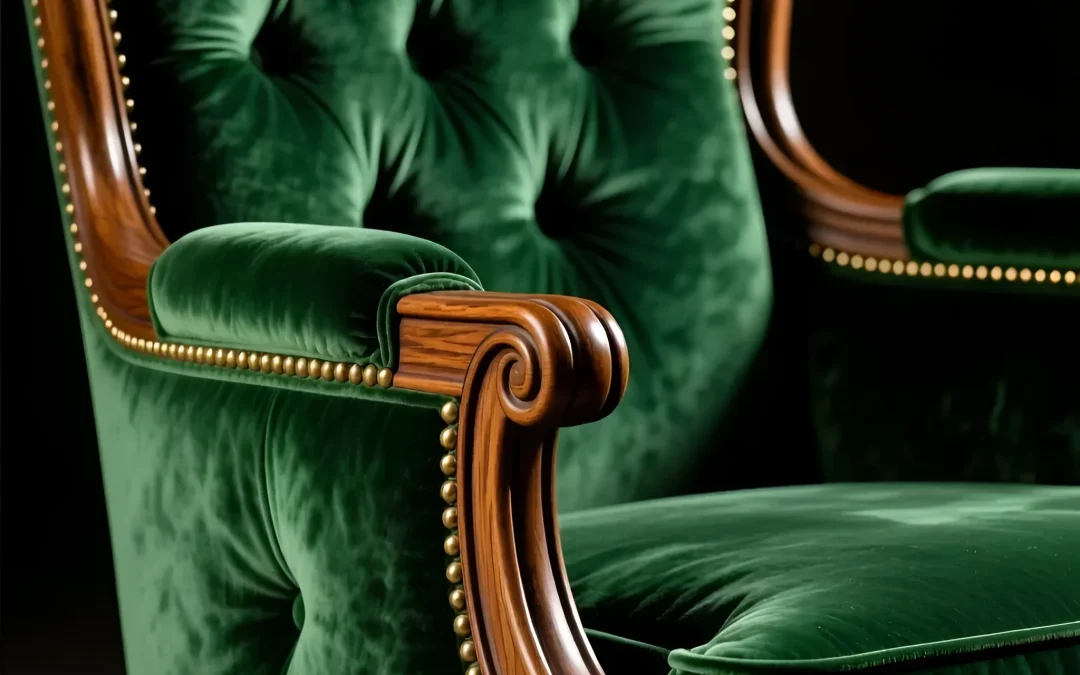 Крупный план винтажного кресла с глубокой изумрудной бархатной обивкой и резными деревянными подлокотниками, украшенными латунными гвоздиками.